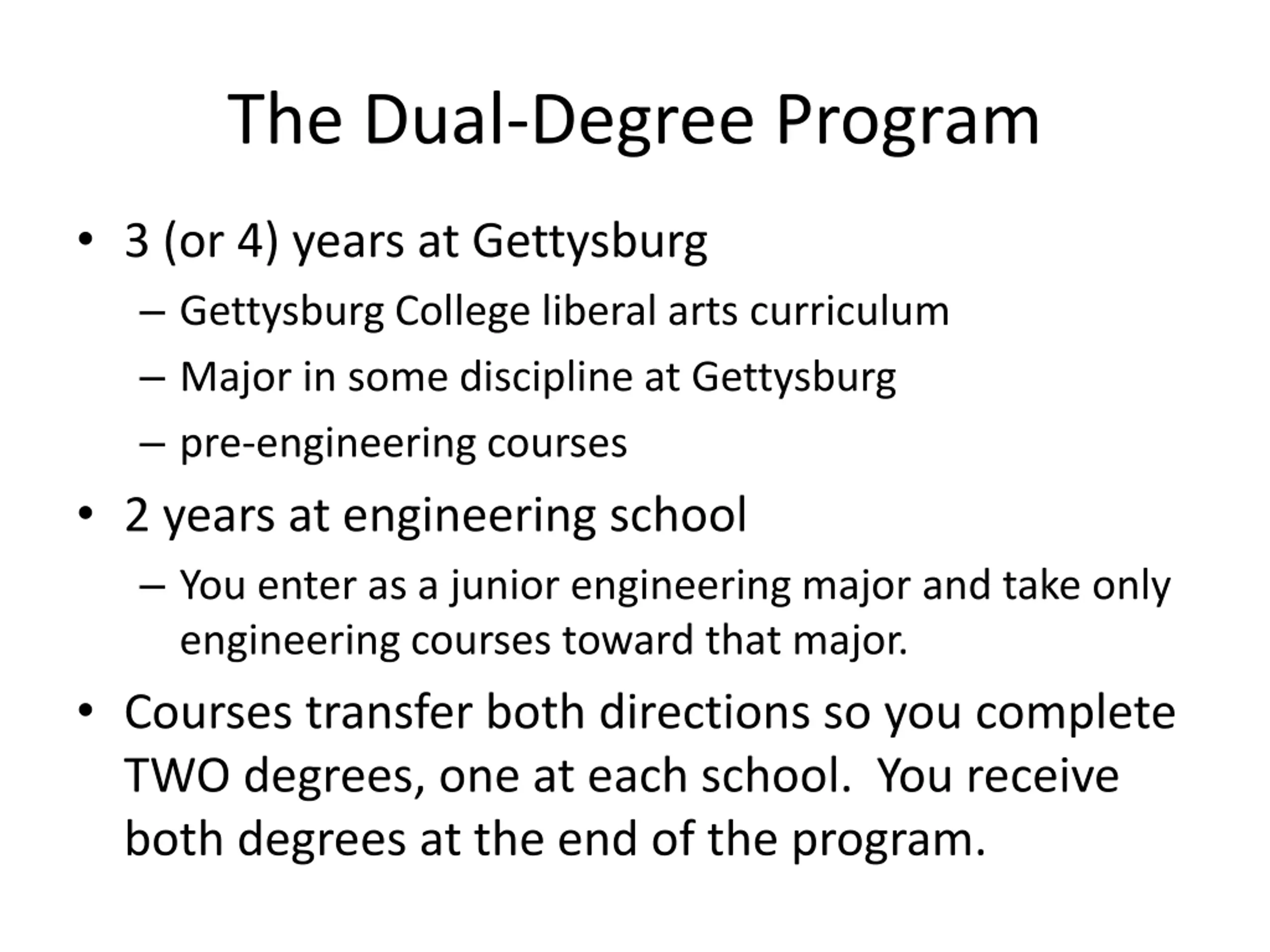 The Dual-Degree Program 3 (or 4) years at Gettysburg Gettysburg College liberal arts curriculum Major in some discipline at Gettysburg pre-engineering courses 2 years at engineering school You enter as a junior engineering major and take only engineering courses toward that major. Courses transfer both directions so you complete TWO degrees, one at each school. You receive both degrees at the end of the program.