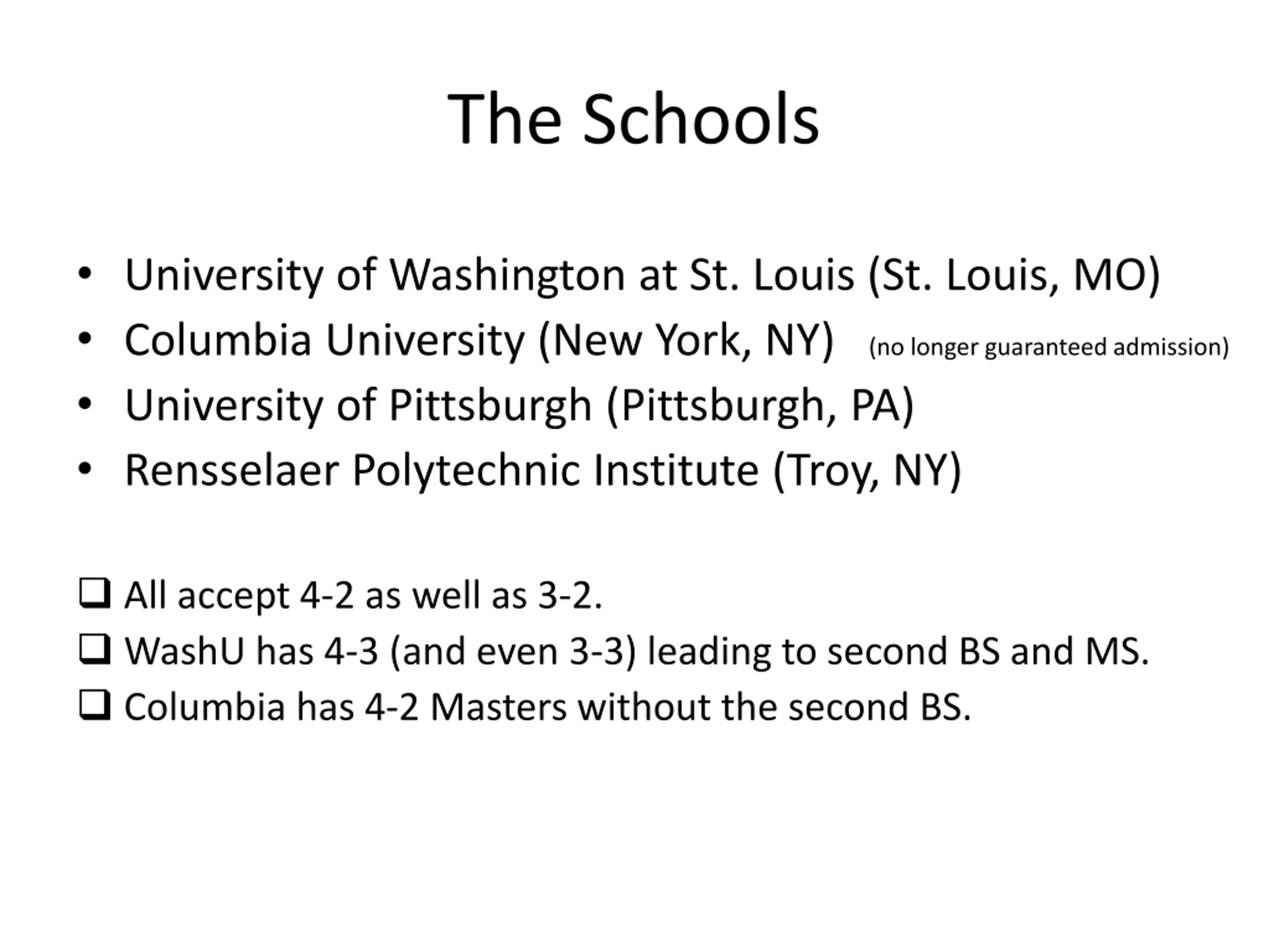 The Schools University of Washington at St. Louis (St. Louis, MO) Columbia University (New York, NY) (no longer guaranteed admission) University of Pittsburgh (Pittsburgh, PA) Rensselaer Polytechnic Institute (Troy, NY) All accept 4-2 as well as 3-2. WashU has 4-3 (and even 3-3) leading to second BS and MS. Columbia has 4-2 Masters without the second BS.