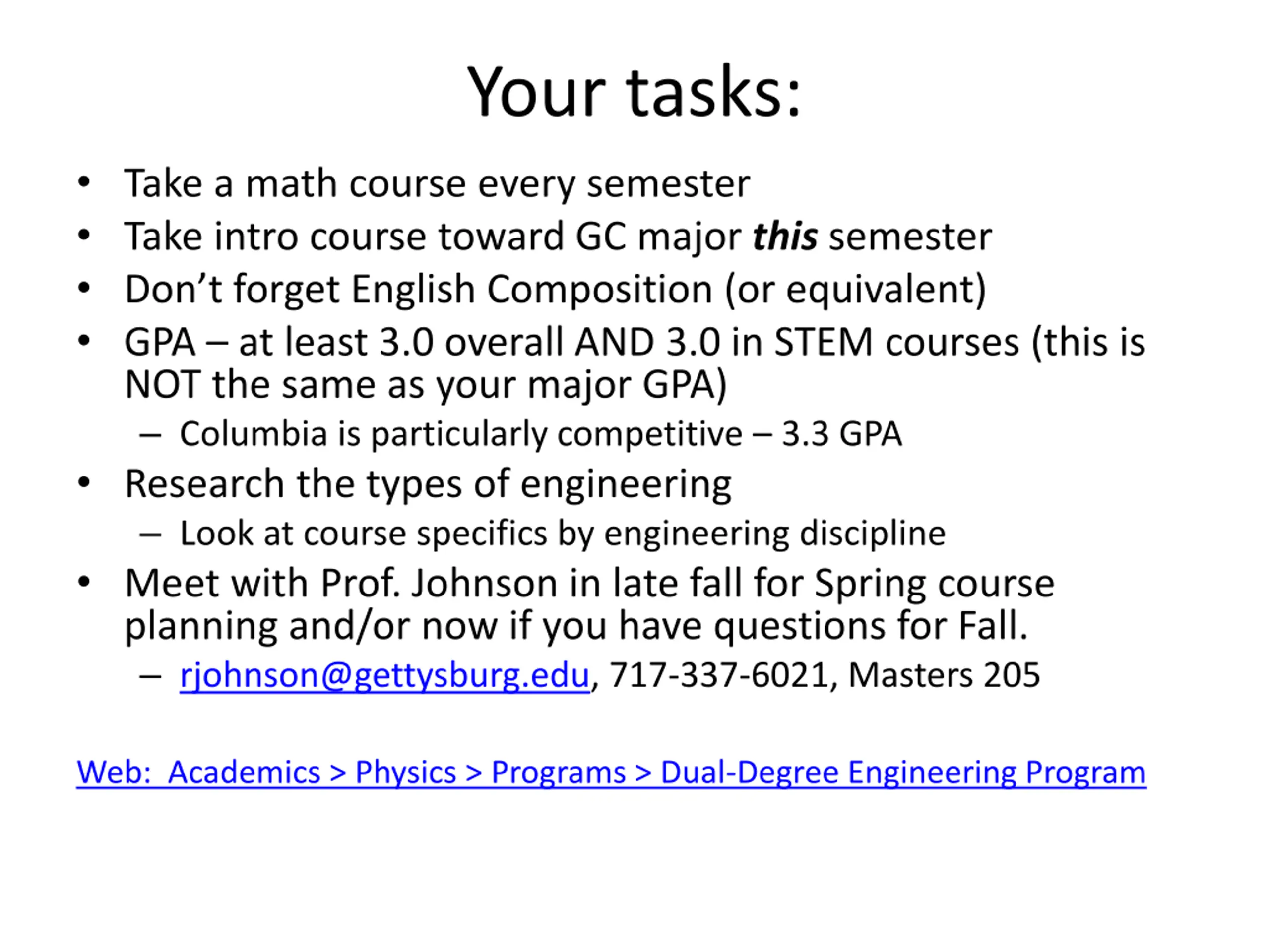 Your tasks: Take a math course every semester Take intro course toward GC major this semester Don t forget English Composition (or equivalent) GPA at least 3.0 overall AND 3.0 in STEM courses (this is NOT the same as your major GPA) Columbia is particularly competitive 3.3 GPA Research the types of engineering Look at course specifics by engineering discipline Meet with Prof. Johnson in late fall for Spring course planning and/or now if you have questions for Fall. rjohnson@gettysburg.edu, 717-337-6021, Masters 205 Web: Academics > Physics > Programs > Dual-Degree Engineering Program