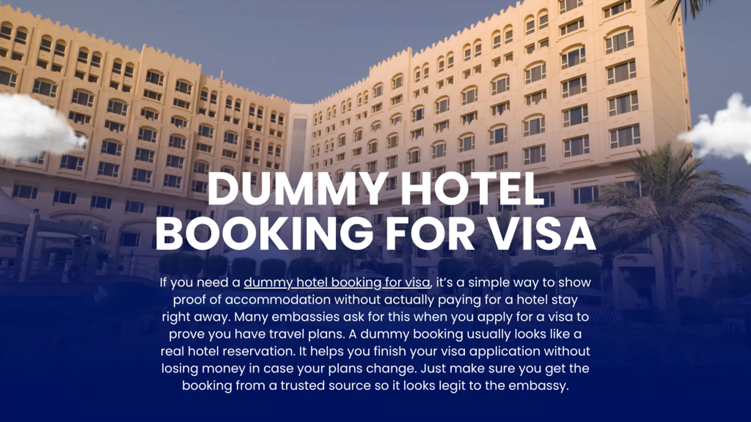 DUMMY HOTEL BOOKING FOR VISA If you need a dummy hotel booking for visa, it s a simple way to show proof of accommodation without actually paying for a hotel stay right away. Many embassies ask for this when you apply for a visa to prove you have travel plans. A dummy booking usually looks like a real hotel reservation. It helps you finish your visa application without losing money in case your plans change. Just make sure you get the booking from a trusted source so it looks legit to the embassy.