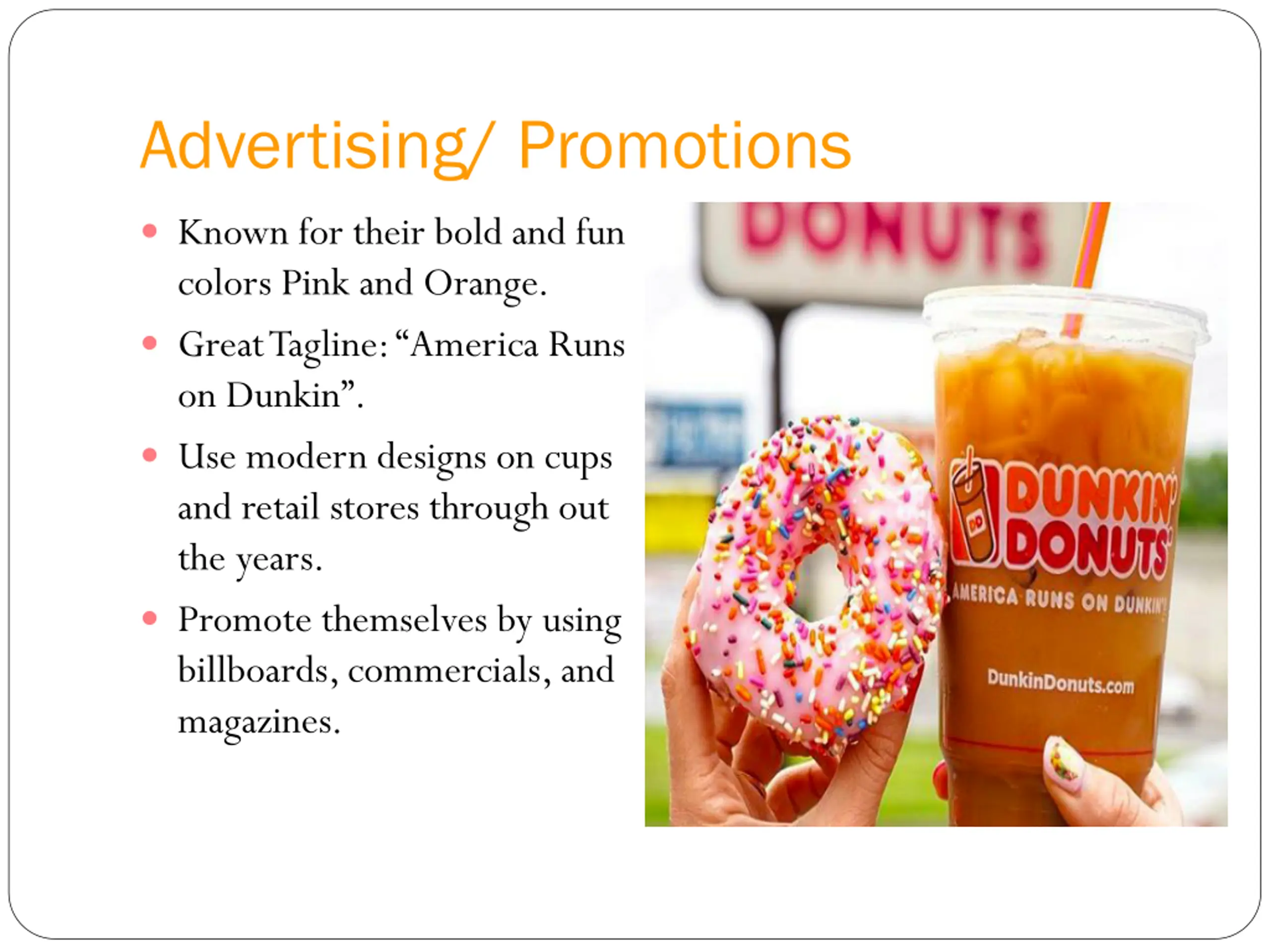 Advertising/ Promotions Known for their bold and fun colors Pink and Orange. Great Tagline: America Runs on Dunkin . Use modern designs on cups and retail stores through out the years. Promote themselves by using billboards, commercials, and magazines.