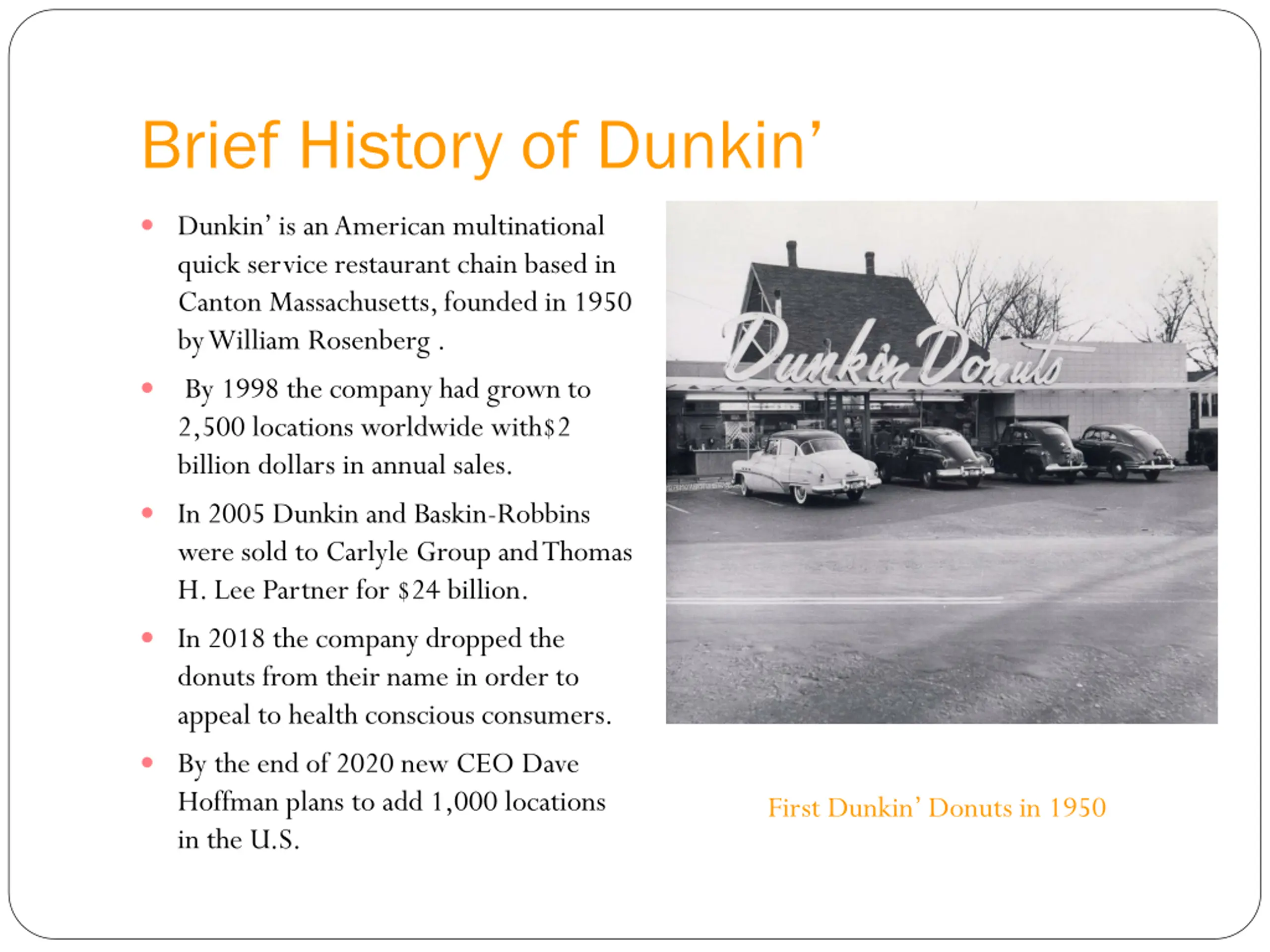 Brief History of Dunkin Dunkin is an American multinational quick service restaurant chain based in Canton Massachusetts, founded in 1950 by William Rosenberg . By 1998 the company had grown to 2,500 locations worldwide with$2 billion dollars in annual sales. In 2005 Dunkin and Baskin-Robbins were sold to Carlyle Group and Thomas H. Lee Partner for $24 billion. In 2018 the company dropped the donuts from their name in order to appeal to health conscious consumers. By the end of 2020 new CEO Dave Hoffman plans to add 1,000 locations in the U.S. First Dunkin Donuts in 1950