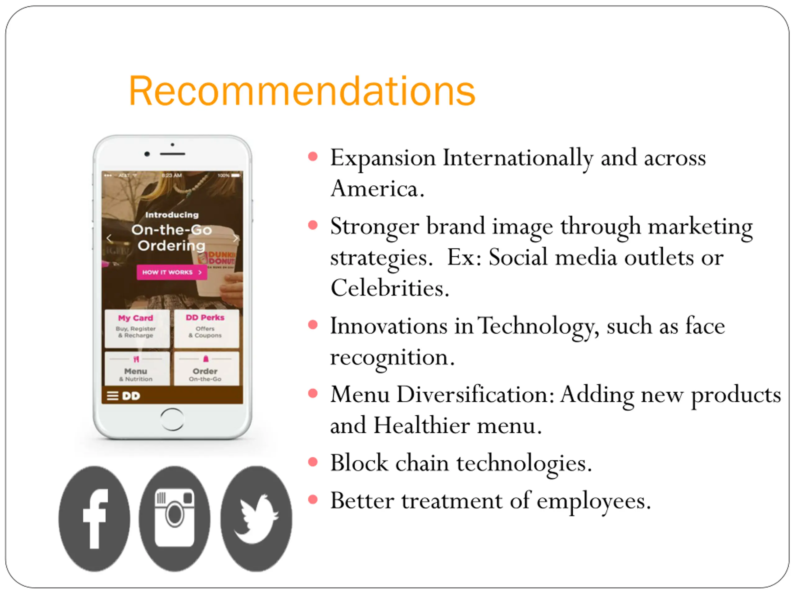 Recommendations Expansion Internationally and across America. Stronger brand image through marketing strategies. Ex: Social media outlets or Celebrities. Innovations in Technology, such as face recognition. Menu Diversification: Adding new products and Healthier menu. Block chain technologies. Better treatment of employees.