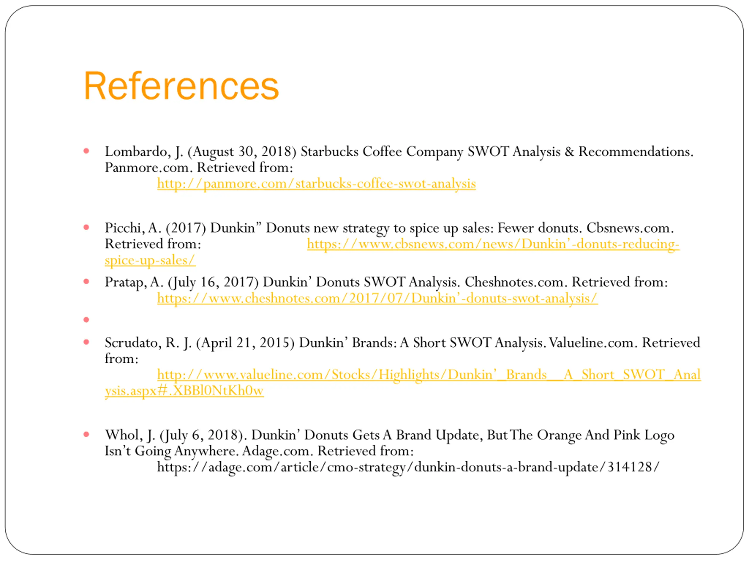 References Lombardo, J. (August 30, 2018) Starbucks Coffee Company SWOT Analysis & Recommendations. Panmore.com. Retrieved from: http://panmore.com/starbucks-coffee-swot-analysis Picchi, A. (2017) Dunkin Donuts new strategy to spice up sales: Fewer donuts. Cbsnews.com. Retrieved from: https://www.cbsnews.com/news/Dunkin -donuts-reducing- spice-up-sales/ Pratap, A. (July 16, 2017) Dunkin Donuts SWOT Analysis. Cheshnotes.com. Retrieved from: https://www.cheshnotes.com/2017/07/Dunkin -donuts-swot-analysis/ Scrudato, R. J. (April 21, 2015) Dunkin Brands: A Short SWOT Analysis. Valueline.com. Retrieved from: http://www.valueline.com/Stocks/Highlights/Dunkin _Brands__A_Short_SWOT_Anal ysis.aspx#.XBBl0NtKh0w Whol, J. (July 6, 2018). Dunkin Donuts Gets A Brand Update, But The Orange And Pink Logo Isn t Going Anywhere. Adage.com. Retrieved from: https://adage.com/article/cmo-strategy/dunkin-donuts-a-brand-update/314128/