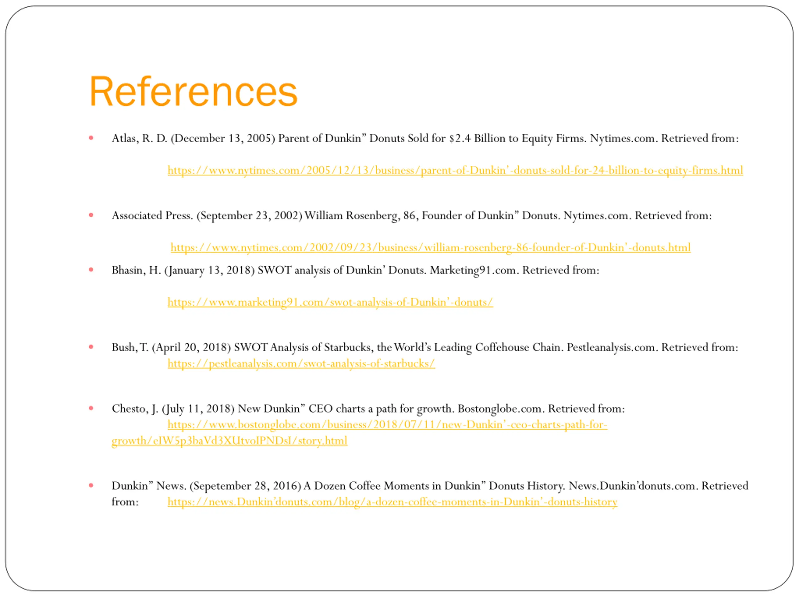 References Atlas, R. D. (December 13, 2005) Parent of Dunkin Donuts Sold for $2.4 Billion to Equity Firms. Nytimes.com. Retrieved from: https://www.nytimes.com/2005/12/13/business/parent-of-Dunkin -donuts-sold-for-24-billion-to-equity-firms.html Associated Press. (September 23, 2002) William Rosenberg, 86, Founder of Dunkin Donuts. Nytimes.com. Retrieved from: https://www.nytimes.com/2002/09/23/business/william-rosenberg-86-founder-of-Dunkin -donuts.html Bhasin, H. (January 13, 2018) SWOT analysis of Dunkin Donuts. Marketing91.com. Retrieved from: https://www.marketing91.com/swot-analysis-of-Dunkin -donuts/ Bush, T. (April 20, 2018) SWOT Analysis of Starbucks, the World s Leading Coffehouse Chain. Pestleanalysis.com. Retrieved from: https://pestleanalysis.com/swot-analysis-of-starbucks/ Chesto, J. (July 11, 2018) New Dunkin CEO charts a path for growth. Bostonglobe.com. Retrieved from: https://www.bostonglobe.com/business/2018/07/11/new-Dunkin -ceo-charts-path-for- growth/eIW5p3baVd3XUtvoIPNDsI/story.html Dunkin News. (Sepetember 28, 2016) A Dozen Coffee Moments in Dunkin Donuts History. News.Dunkin donuts.com. Retrieved from: https://news.Dunkin donuts.com/blog/a-dozen-coffee-moments-in-Dunkin -donuts-history