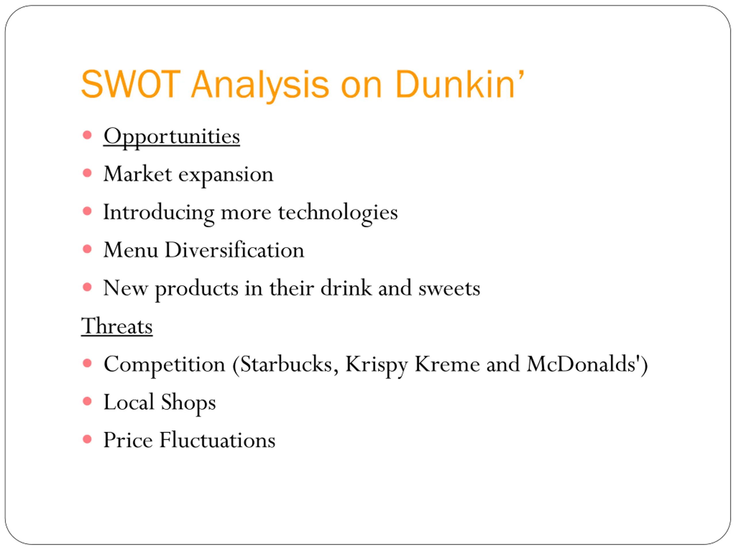 SWOT Analysis on Dunkin Opportunities Market expansion Introducing more technologies Menu Diversification New products in their drink and sweets Threats Competition (Starbucks, Krispy Kreme and McDonalds') Local Shops Price Fluctuations