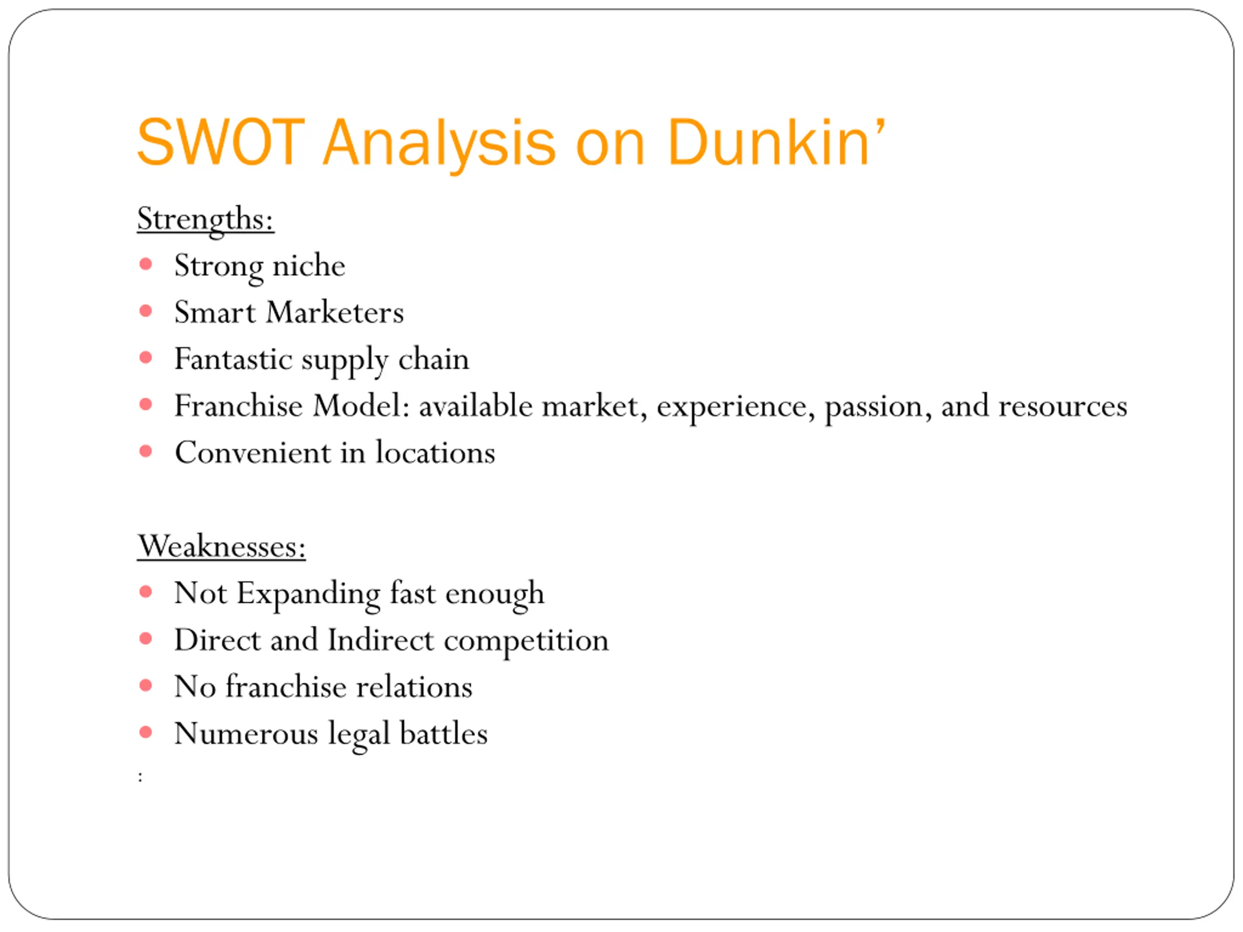 SWOT Analysis on Dunkin Strengths: Strong niche Smart Marketers Fantastic supply chain Franchise Model: available market, experience, passion, and resources Convenient in locations Weaknesses: Not Expanding fast enough Direct and Indirect competition No franchise relations Numerous legal battles :