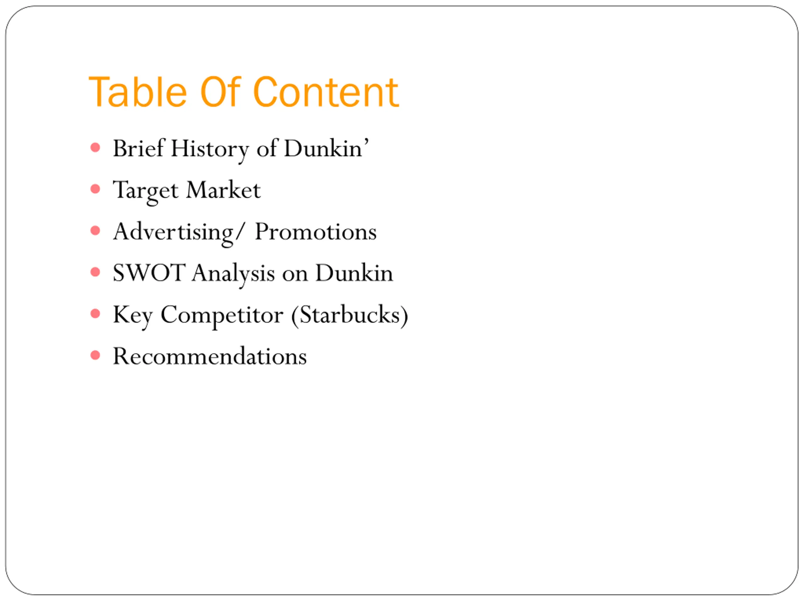 Table Of Content Brief History of Dunkin Target Market Advertising/ Promotions SWOT Analysis on Dunkin Key Competitor (Starbucks) Recommendations