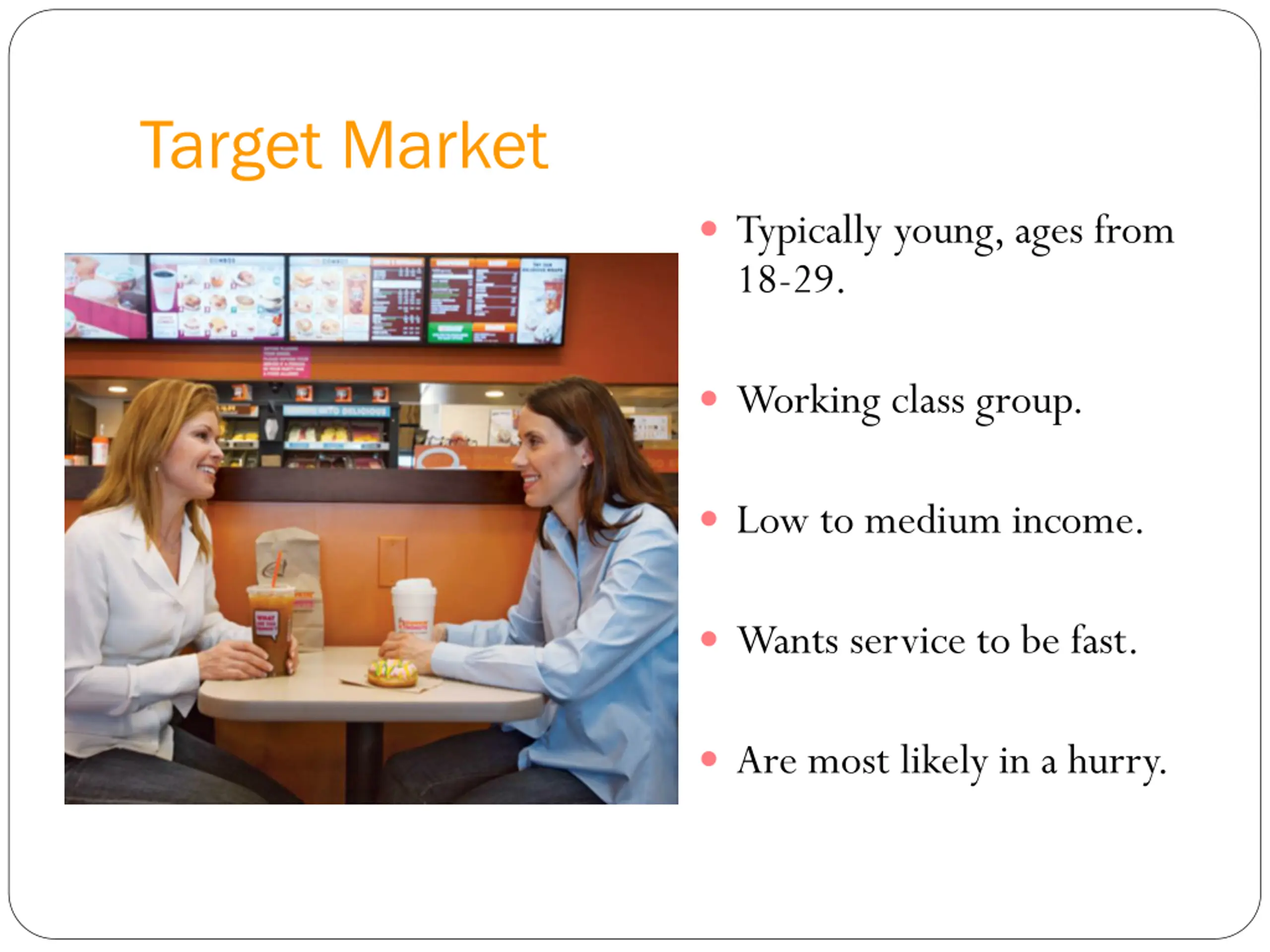 Target Market Typically young, ages from 18-29. Working class group. Low to medium income. Wants service to be fast. Are most likely in a hurry.