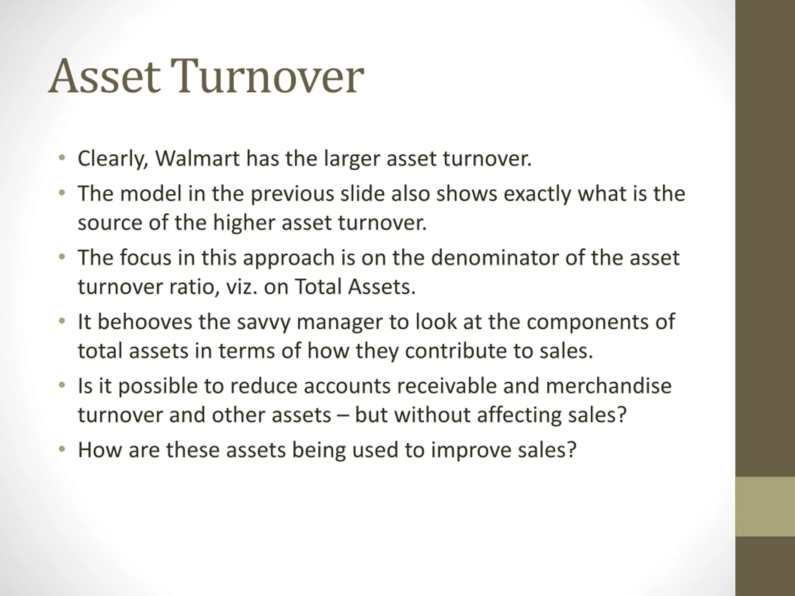 Asset Turnover Clearly, Walmart has the larger asset turnover. The model in the previous slide also shows exactly what is the source of the higher asset turnover. The focus in this approach is on the denominator of the asset turnover ratio, viz. on Total Assets. It behooves the savvy manager to look at the components of total assets in terms of how they contribute to sales. Is it possible to reduce accounts receivable and merchandise turnover and other assets but without affecting sales? How are these assets being used to improve sales?