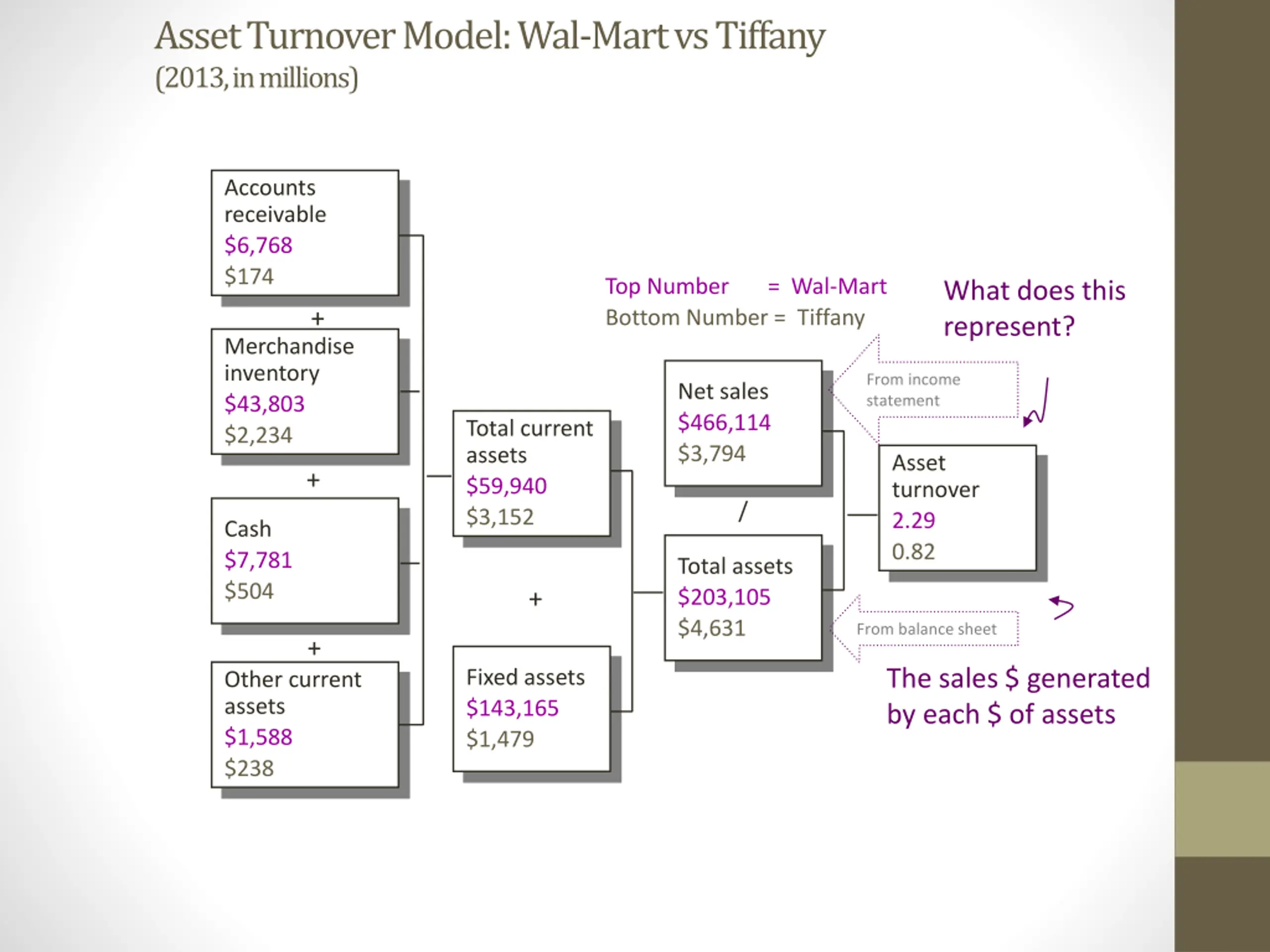 Asset Turnover Model: Wal-Mart vs Tiffany (2013, in millions) Accounts receivable $6,768 $174 Top Number = Wal-Mart Bottom Number = Tiffany What does this represent? + Merchandise inventory $43,803 $2,234 From income statement Net sales $466,114 $3,794 Total current assets $59,940 $3,152 Asset turnover 2.29 0.82 + / Cash $7,781 $504 Total assets $203,105 $4,631 + From balance sheet + The sales $ generated by each $ of assets Fixed assets $143,165 $1,479 Other current assets $1,588 $238