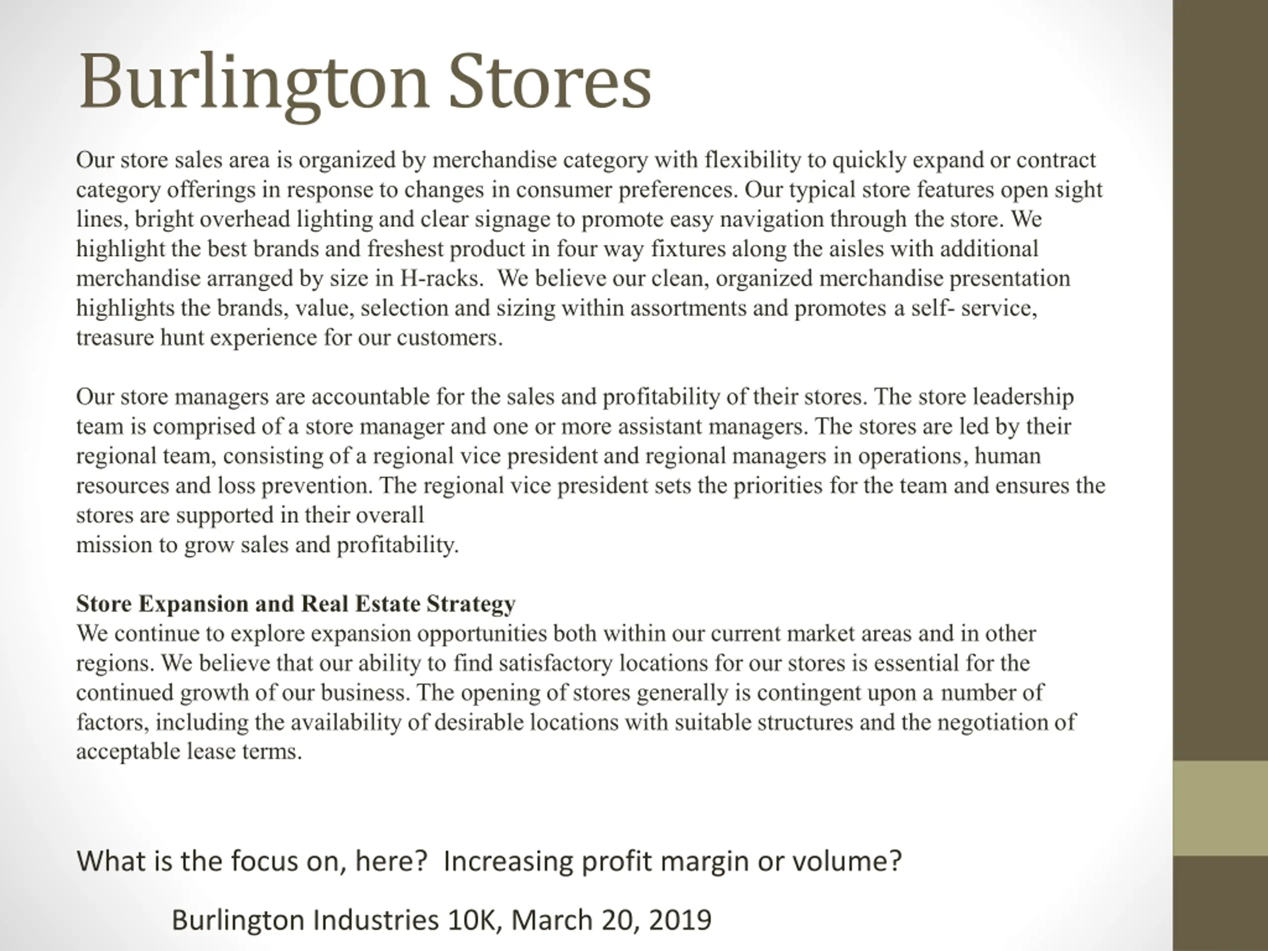 Burlington Stores Our store sales area is organized by merchandise category with flexibility to quickly expand or contract category offerings in response to changes in consumer preferences. Our typical store features open sight lines, bright overhead lighting and clear signage to promote easy navigation through the store. We highlight the best brands and freshest product in four way fixtures along the aisles with additional merchandise arranged by size in H-racks. We believe our clean, organized merchandise presentation highlights the brands, value, selection and sizing within assortments and promotes a self- service, treasure hunt experience for our customers. Our store managers are accountable for the sales and profitability of their stores. The store leadership team is comprised of a store manager and one or more assistant managers. The stores are led by their regional team, consisting of a regional vice president and regional managers in operations, human resources and loss prevention. The regional vice president sets the priorities for the team and ensures the stores are supported in their overall mission to grow sales and profitability. Store Expansion and Real Estate Strategy We continue to explore expansion opportunities both within our current market areas and in other regions. We believe that our ability to find satisfactory locations for our stores is essential for the continued growth of our business. The opening of stores generally is contingent upon a number of factors, including the availability of desirable locations with suitable structures and the negotiation of acceptable lease terms. What is the focus on, here? Increasing profit margin or volume? Burlington Industries 10K, March 20, 2019