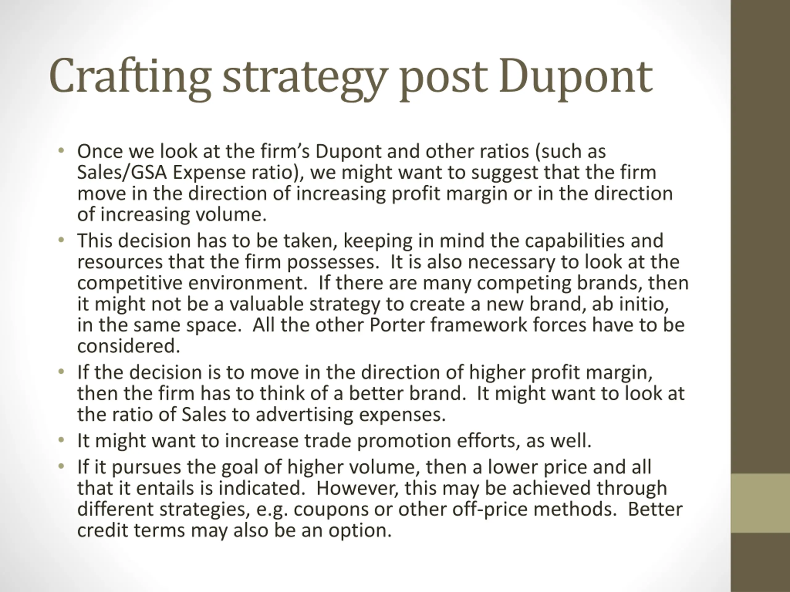 Crafting strategy post Dupont Once we look at the firm s Dupont and other ratios (such as Sales/GSA Expense ratio), we might want to suggest that the firm move in the direction of increasing profit margin or in the direction of increasing volume. This decision has to be taken, keeping in mind the capabilities and resources that the firm possesses. It is also necessary to look at the competitive environment. If there are many competing brands, then it might not be a valuable strategy to create a new brand, ab initio, in the same space. All the other Porter framework forces have to be considered. If the decision is to move in the direction of higher profit margin, then the firm has to think of a better brand. It might want to look at the ratio of Sales to advertising expenses. It might want to increase trade promotion efforts, as well. If it pursues the goal of higher volume, then a lower price and all that it entails is indicated. However, this may be achieved through different strategies, e.g. coupons or other off-price methods. Better credit terms may also be an option.