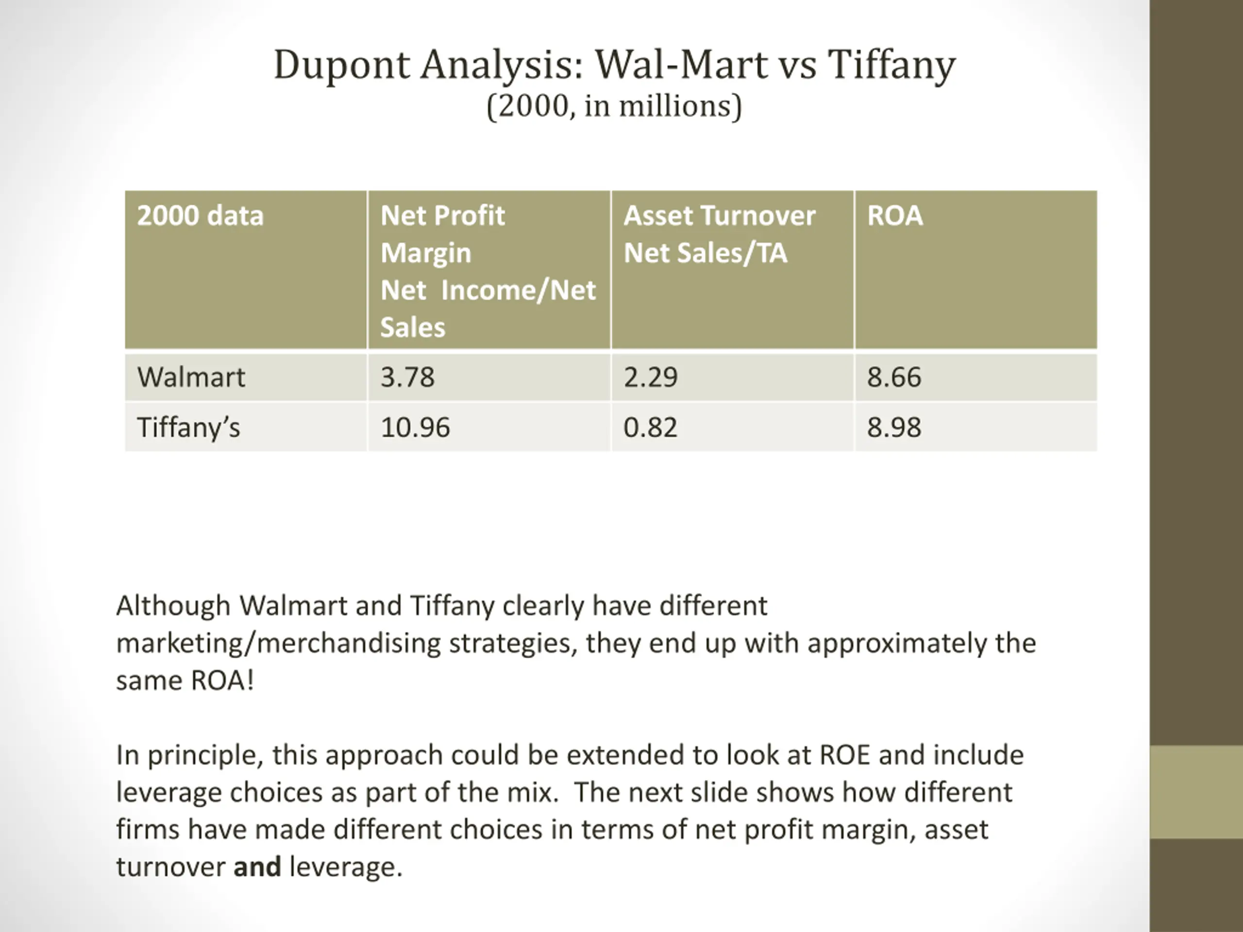 Dupont Analysis: Wal-Mart vs Tiffany (2000, in millions) 2000 data Net Profit Margin Net Income/Net Sales Asset Turnover Net Sales/TA ROA Walmart 3.78 2.29 8.66 Tiffany s 10.96 0.82 8.98 Although Walmart and Tiffany clearly have different marketing/merchandising strategies, they end up with approximately the same ROA! In principle, this approach could be extended to look at ROE and include leverage choices as part of the mix. The next slide shows how different firms have made different choices in terms of net profit margin, asset turnover and leverage.