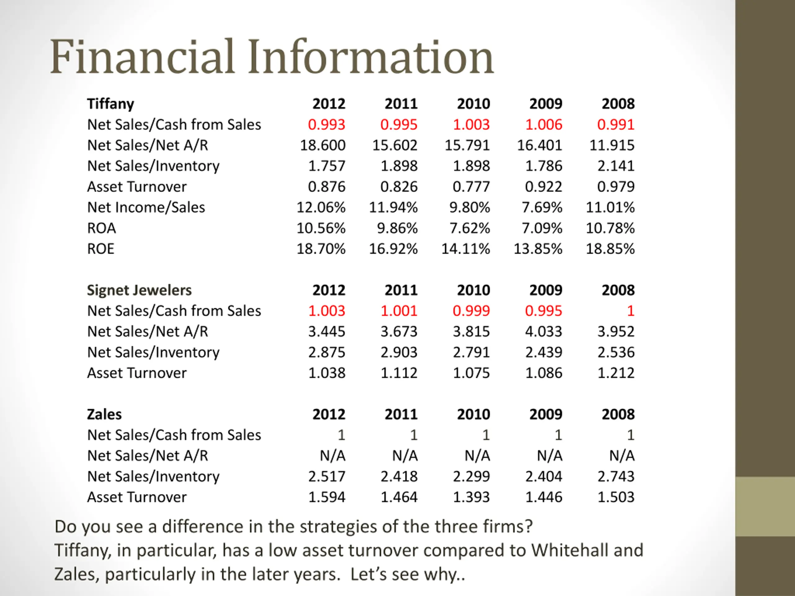 Financial Information Tiffany Net Sales/Cash from Sales Net Sales/Net A/R Net Sales/Inventory Asset Turnover Net Income/Sales ROA ROE 2012 0.993 18.600 1.757 0.876 12.06% 10.56% 18.70% 2011 0.995 15.602 1.898 0.826 11.94% 9.86% 16.92% 2010 1.003 15.791 1.898 0.777 9.80% 7.62% 14.11% 2009 1.006 16.401 1.786 0.922 7.69% 7.09% 13.85% 2008 0.991 11.915 2.141 0.979 11.01% 10.78% 18.85% Signet Jewelers Net Sales/Cash from Sales Net Sales/Net A/R Net Sales/Inventory Asset Turnover 2012 1.003 3.445 2.875 1.038 2011 1.001 3.673 2.903 1.112 2010 0.999 3.815 2.791 1.075 2009 0.995 4.033 2.439 1.086 2008 1 3.952 2.536 1.212 Zales Net Sales/Cash from Sales Net Sales/Net A/R Net Sales/Inventory Asset Turnover 2012 2011 2010 2009 2008 1 1 1 1 1 N/A 2.517 1.594 N/A 2.418 1.464 N/A 2.299 1.393 N/A 2.404 1.446 N/A 2.743 1.503 Do you see a difference in the strategies of the three firms? Tiffany, in particular, has a low asset turnover compared to Whitehall and Zales, particularly in the later years. Let s see why..