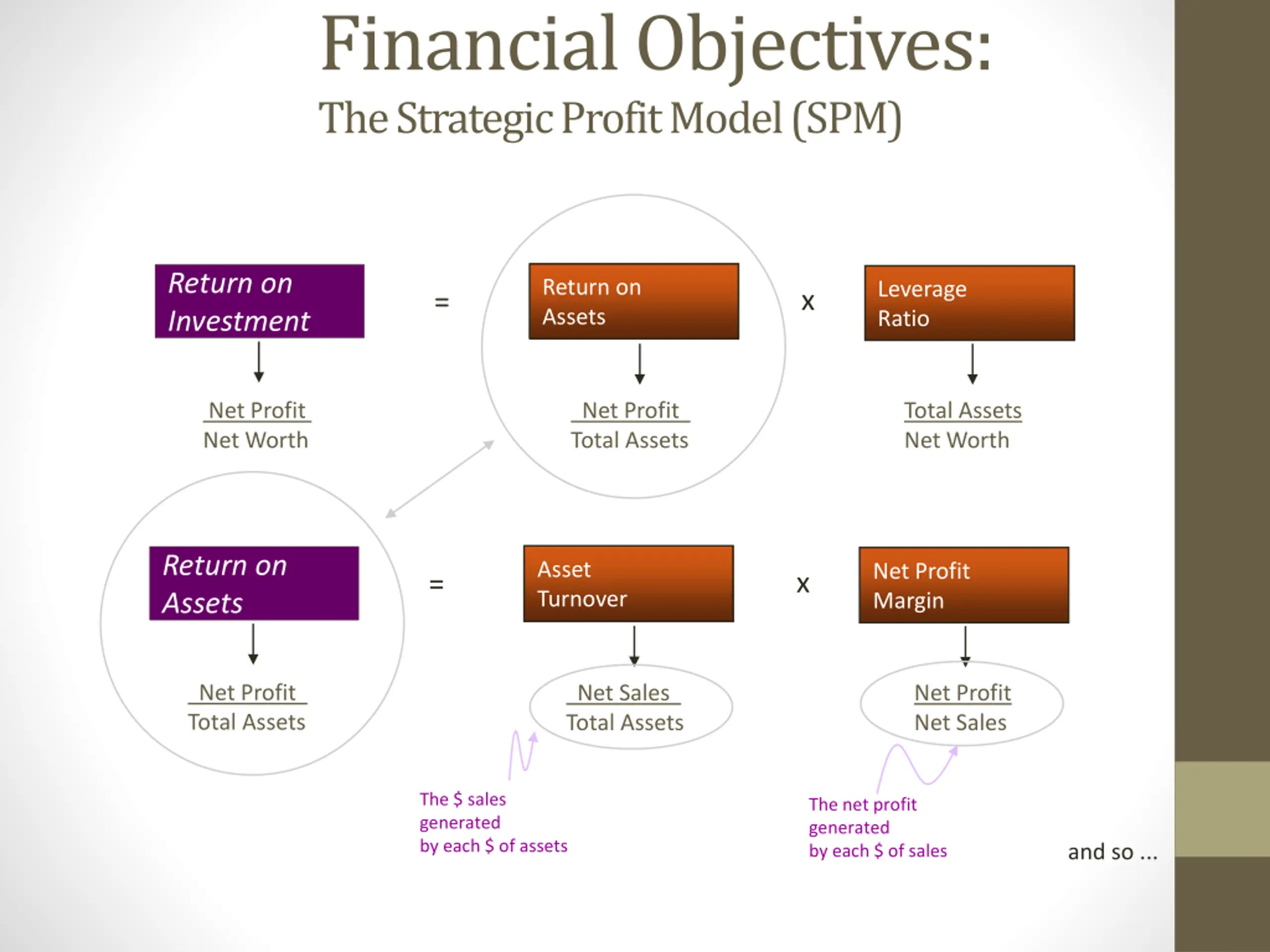 Financial Objectives: The Strategic Profit Model (SPM) Return on Investment Return on Assets Leverage Ratio x = Net Profit Net Worth Net Profit Total Assets Total Assets Net Worth Return on Assets Asset Turnover Net Profit Margin x = Net Profit Total Assets Net Sales Total Assets Net Profit Net Sales The $ sales generated by each $ of assets The net profit generated by each $ of sales and so ...