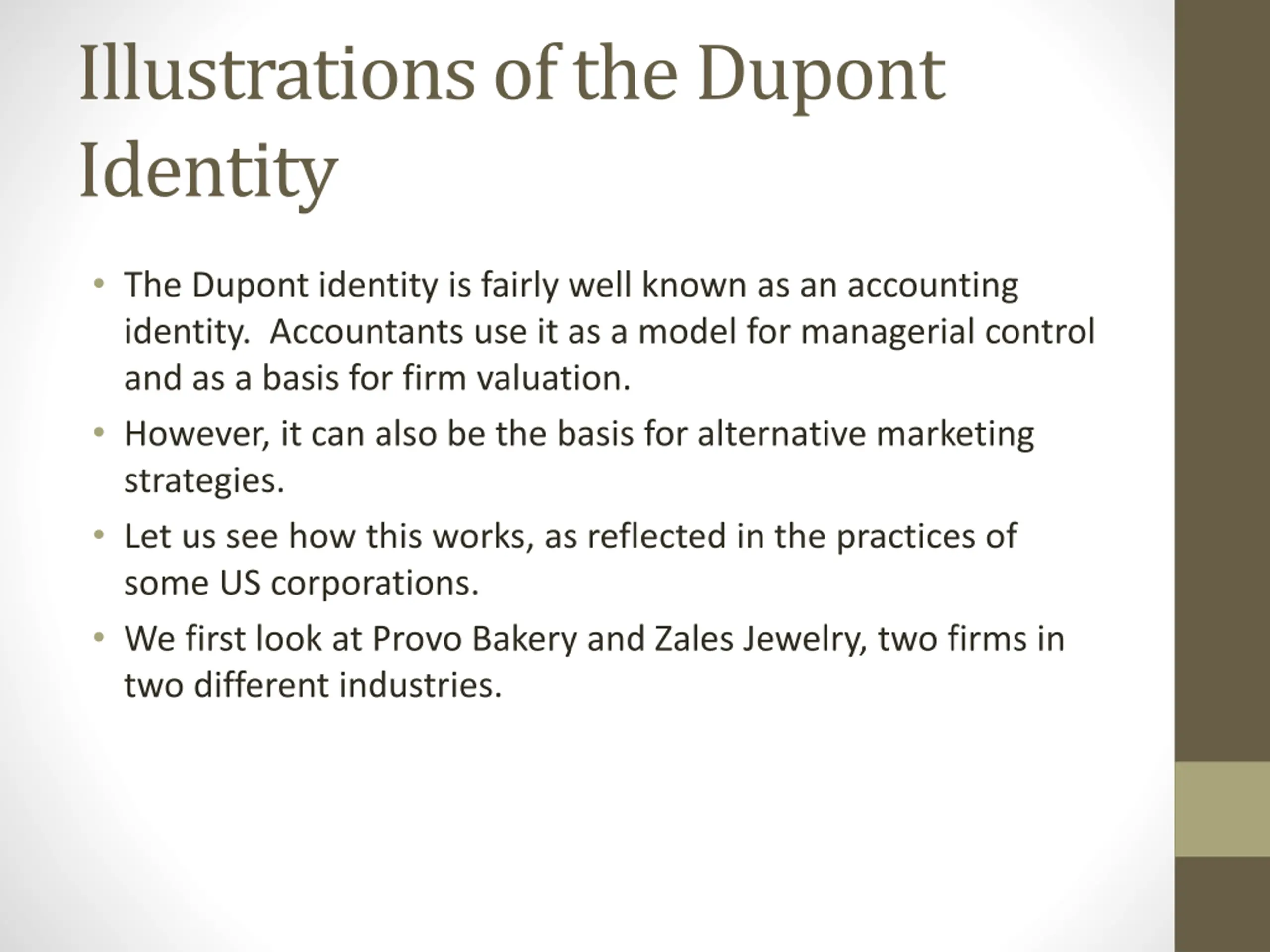 Illustrations of the Dupont Identity The Dupont identity is fairly well known as an accounting identity. Accountants use it as a model for managerial control and as a basis for firm valuation. However, it can also be the basis for alternative marketing strategies. Let us see how this works, as reflected in the practices of some US corporations. We first look at Provo Bakery and Zales Jewelry, two firms in two different industries.