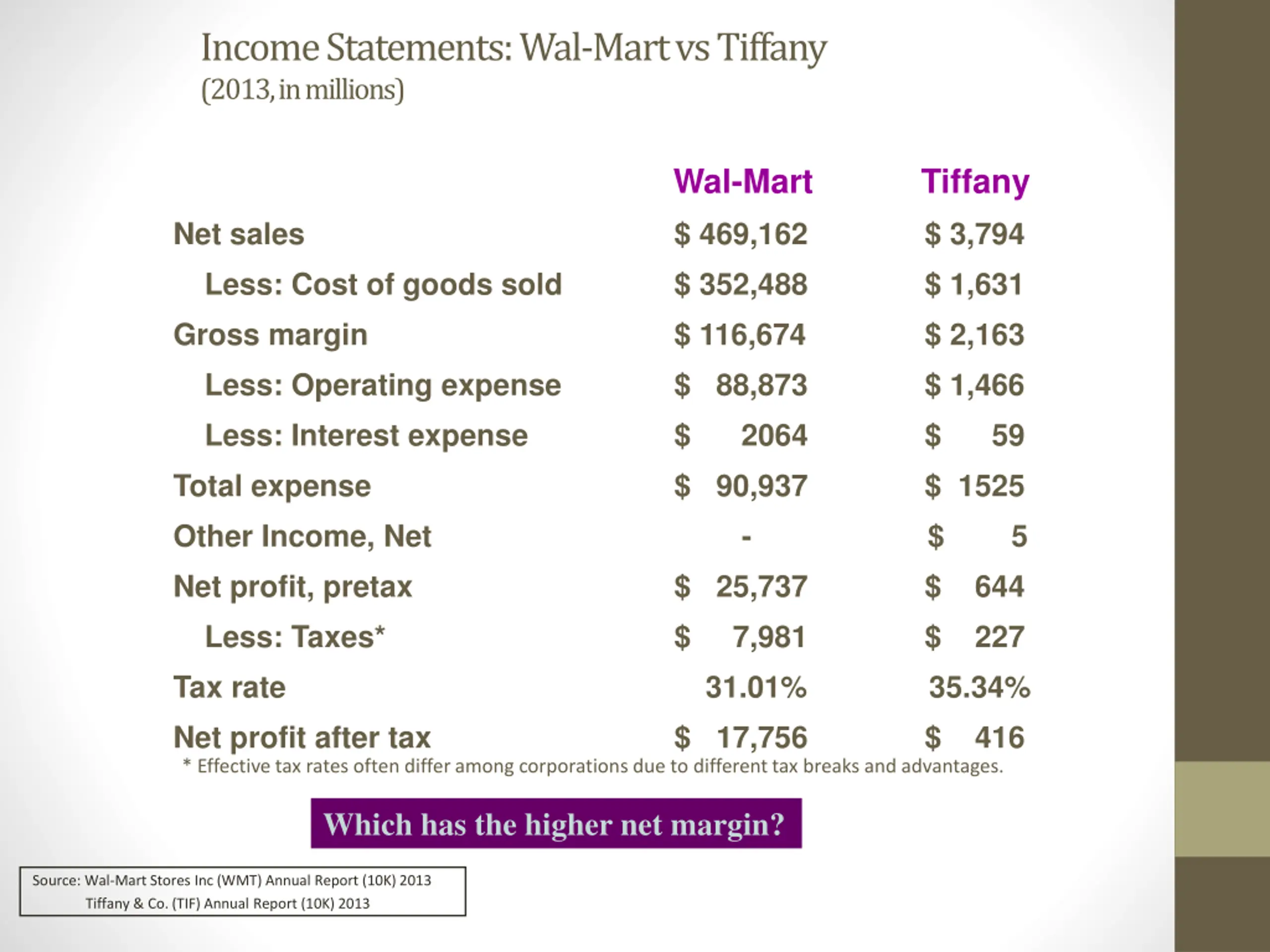 Income Statements: Wal-Mart vs Tiffany (2013, in millions) Wal-Mart Tiffany Net sales $ 469,162 $ 3,794 Less: Cost of goods sold $ 352,488 $ 1,631 Gross margin $ 116,674 $ 2,163 Less: Operating expense $ 88,873 $ 1,466 Less: Interest expense $ 2064 $ 59 Total expense $ 90,937 $ 1525 Other Income, Net - $ 5 Net profit, pretax $ 25,737 Less: Taxes* $ 7,981 $ 227 Tax rate 31.01% 35.34% Net profit after tax $ 17,756 $ 416 $ 644 * Effective tax rates often differ among corporations due to different tax breaks and advantages. Which has the higher net margin? Source: Wal-Mart Stores Inc (WMT) Annual Report (10K) 2013 Tiffany & Co. (TIF) Annual Report (10K) 2013