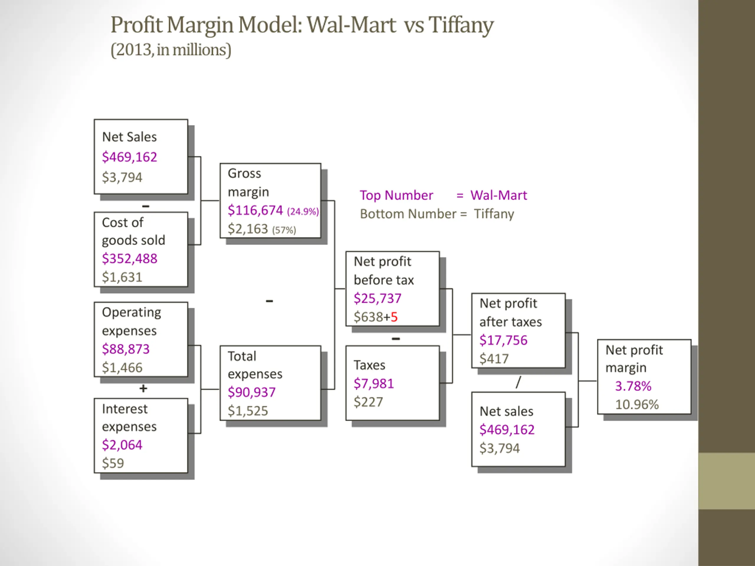 Profit Margin Model: Wal-Mart vs Tiffany (2013, in millions) Net Sales $469,162 $3,794 Gross margin $116,674 (24.9%) $2,163 (57%) Top Number = Wal-Mart Bottom Number = Tiffany - Cost of goods sold $352,488 $1,631 Net profit before tax $25,737 $638+5 - Net profit after taxes $17,756 $417 Operating expenses $88,873 $1,466 - Net profit margin 3.78% 10.96% Total expenses $90,937 $1,525 Taxes $7,981 $227 / + Interest expenses $2,064 $59 Net sales $469,162 $3,794