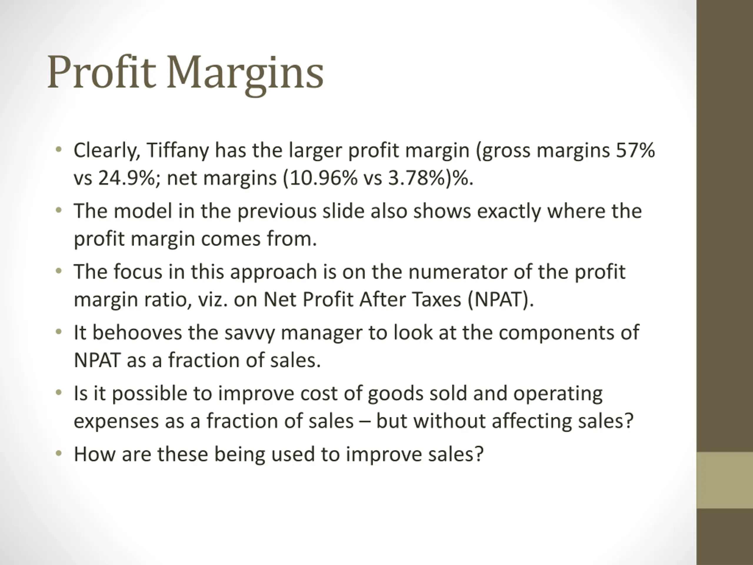 Profit Margins Clearly, Tiffany has the larger profit margin (gross margins 57% vs 24.9%; net margins (10.96% vs 3.78%)%. The model in the previous slide also shows exactly where the profit margin comes from. The focus in this approach is on the numerator of the profit margin ratio, viz. on Net Profit After Taxes (NPAT). It behooves the savvy manager to look at the components of NPAT as a fraction of sales. Is it possible to improve cost of goods sold and operating expenses as a fraction of sales but without affecting sales? How are these being used to improve sales?