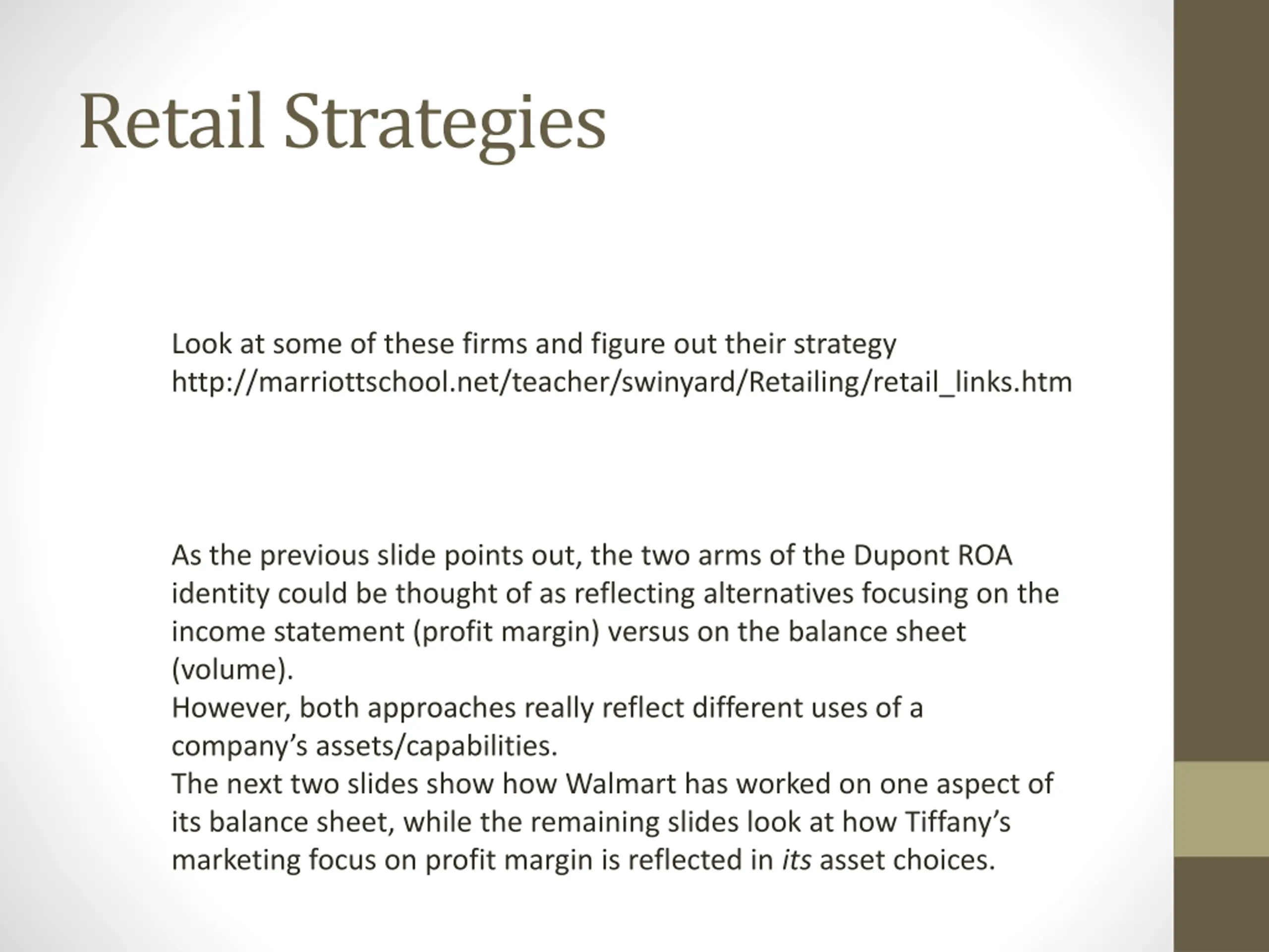 Retail Strategies Look at some of these firms and figure out their strategy http://marriottschool.net/teacher/swinyard/Retailing/retail_links.htm As the previous slide points out, the two arms of the Dupont ROA identity could be thought of as reflecting alternatives focusing on the income statement (profit margin) versus on the balance sheet (volume). However, both approaches really reflect different uses of a company s assets/capabilities. The next two slides show how Walmart has worked on one aspect of its balance sheet, while the remaining slides look at how Tiffany s marketing focus on profit margin is reflected in its asset choices.