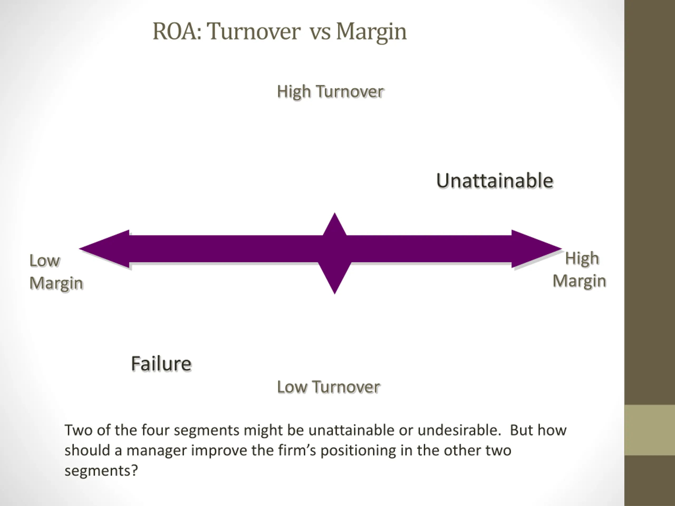 ROA: Turnover vs Margin High Turnover Unattainable High Margin Low Margin Failure Low Turnover Two of the four segments might be unattainable or undesirable. But how should a manager improve the firm s positioning in the other two segments?