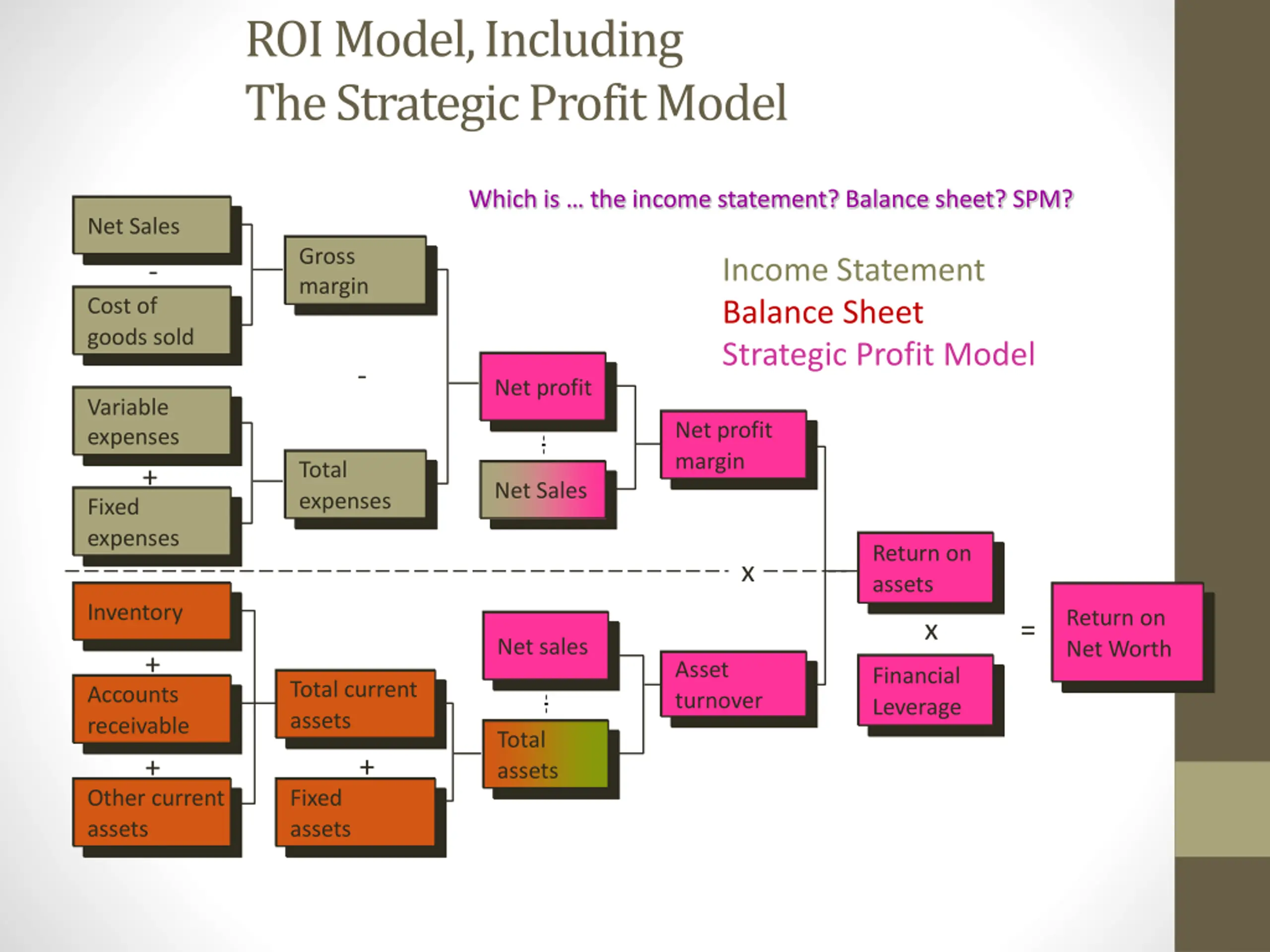 ROI Model, Including The Strategic Profit Model Which is the income statement? Balance sheet? SPM? Net Sales Net Sales Gross margin margin Gross Income Statement Balance Sheet Strategic Profit Model - Cost of goods sold goods sold Cost of - Net profit Net profit Variable expenses expenses Variable Net profit margin margin Net profit Total expenses expenses Total + Net Sales Net Sales Fixed expenses expenses Fixed Return on assets assets Return on x Inventory Inventory Return on Net Worth Net Worth Return on x = Net sales Net sales + Asset turnover turnover Asset Financial Leverage Leverage Financial Total current assets assets Total current Accounts receivable receivable Accounts Total assets assets Total + + Other current assets assets Fixed assets assets Other current Fixed