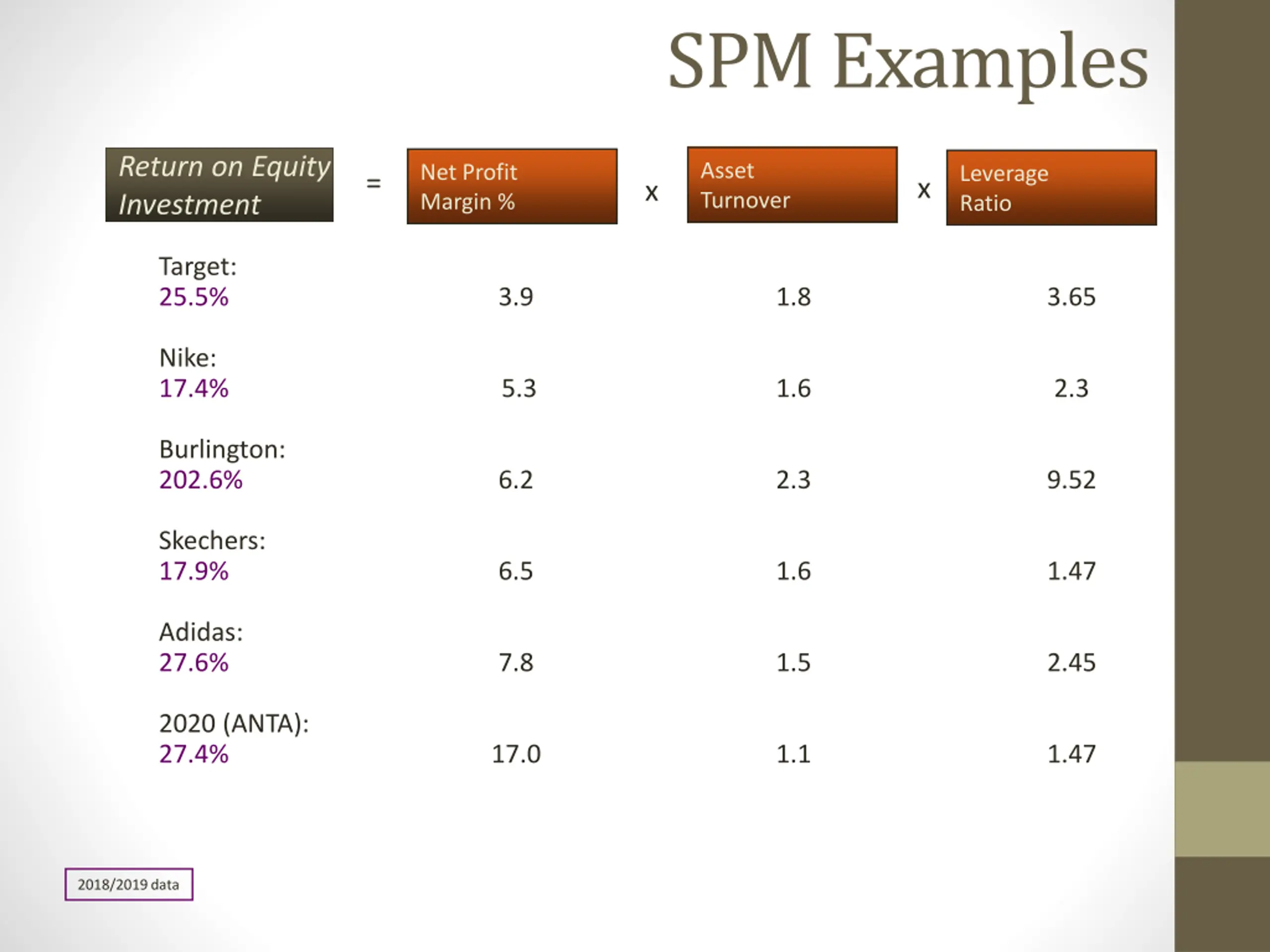 SPM Examples Return on Equity Investment Asset Turnover Net Profit Margin % Leverage Ratio = x x Target: 25.5% 3.9 1.8 3.65 Nike: 17.4% 5.3 1.6 2.3 Burlington: 202.6% 6.2 2.3 9.52 Skechers: 17.9% Adidas: 27.6% 6.5 1.6 1.47 7.8 1.5 2.45 2020 (ANTA): 27.4% 17.0 1.1 1.47 2018/2019 data