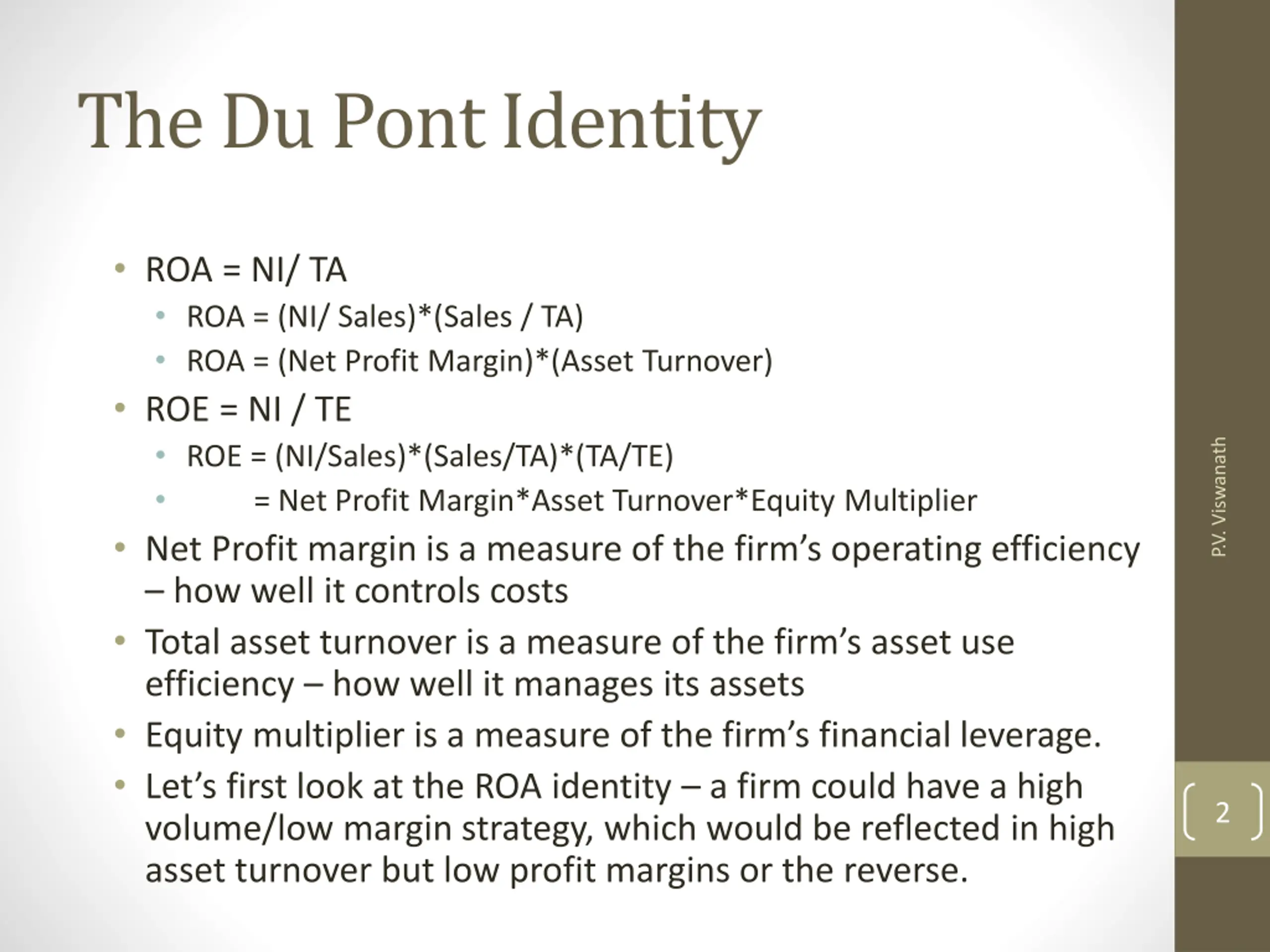 The Du Pont Identity ROA = NI/ TA ROA = (NI/ Sales)*(Sales / TA) ROA = (Net Profit Margin)*(Asset Turnover) ROE = NI / TE ROE = (NI/Sales)*(Sales/TA)*(TA/TE) = Net Profit Margin*Asset Turnover*Equity Multiplier Net Profit margin is a measure of the firm s operating efficiency how well it controls costs Total asset turnover is a measure of the firm s asset use efficiency how well it manages its assets Equity multiplier is a measure of the firm s financial leverage. Let s first look at the ROA identity a firm could have a high volume/low margin strategy, which would be reflected in high asset turnover but low profit margins or the reverse. P.V. Viswanath 2