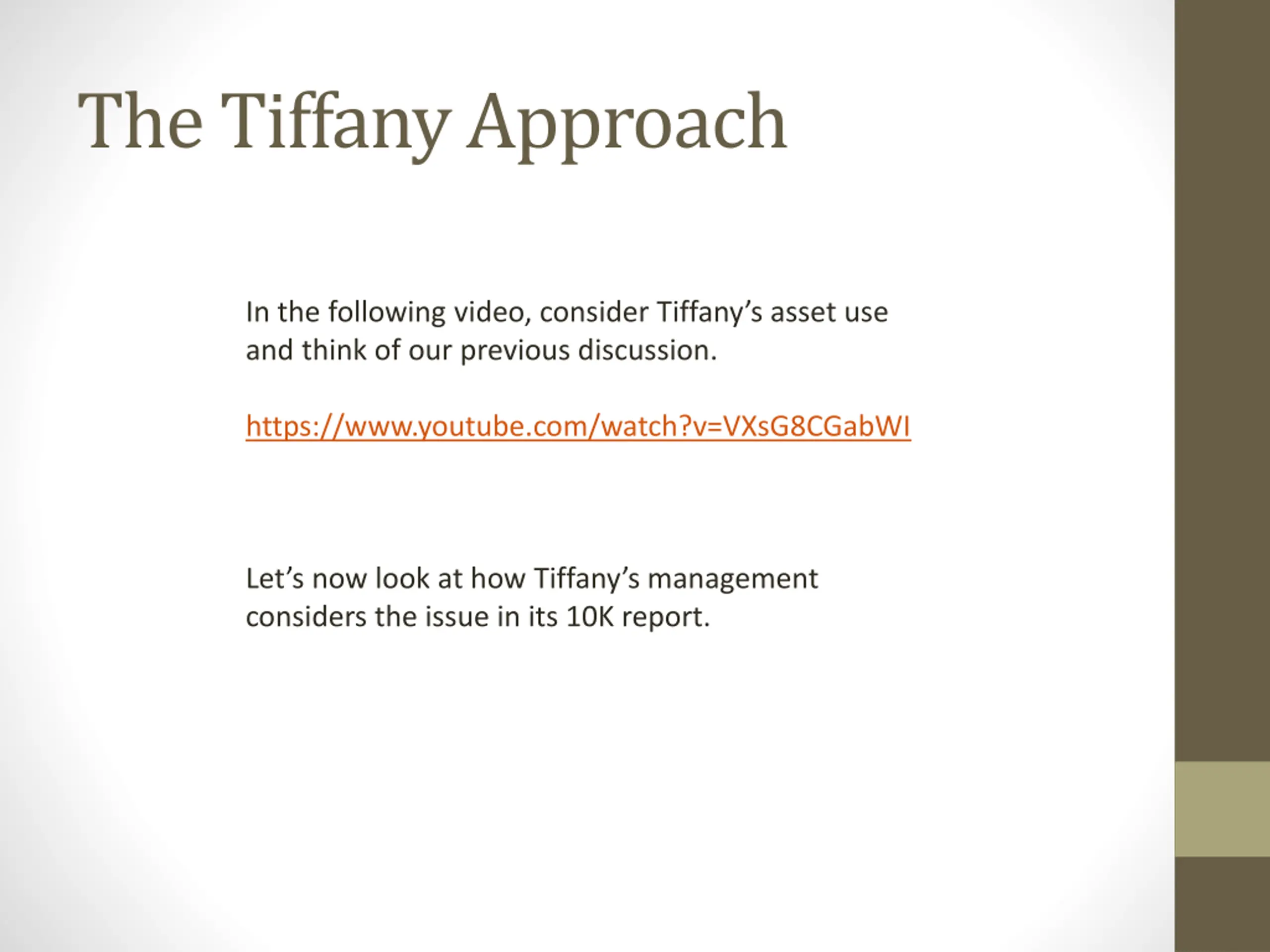The Tiffany Approach In the following video, consider Tiffany s asset use and think of our previous discussion. https://www.youtube.com/watch?v=VXsG8CGabWI Let s now look at how Tiffany s management considers the issue in its 10K report.