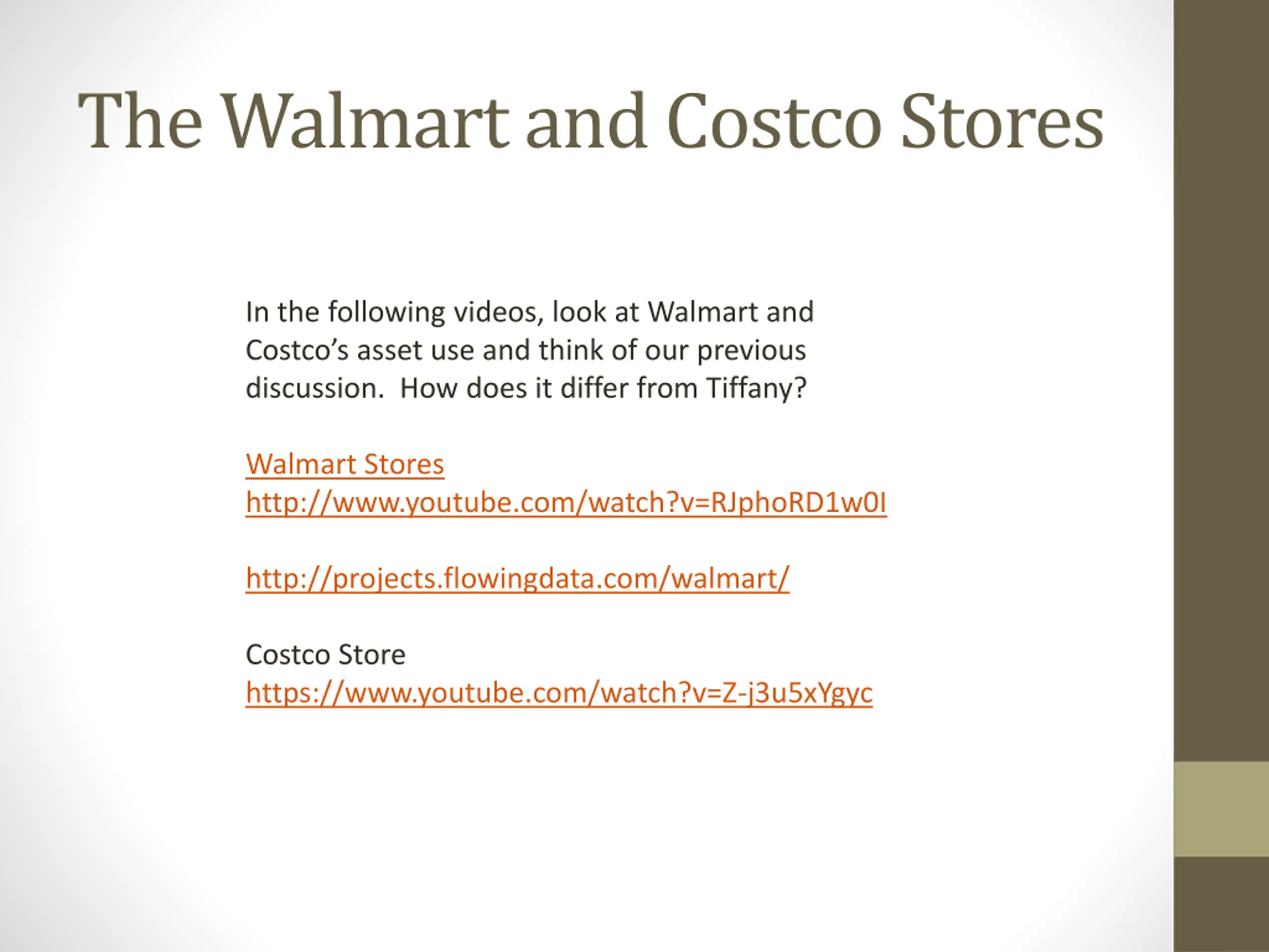 The Walmart and Costco Stores In the following videos, look at Walmart and Costco s asset use and think of our previous discussion. How does it differ from Tiffany? Walmart Stores http://www.youtube.com/watch?v=RJphoRD1w0I http://projects.flowingdata.com/walmart/ Costco Store https://www.youtube.com/watch?v=Z-j3u5xYgyc