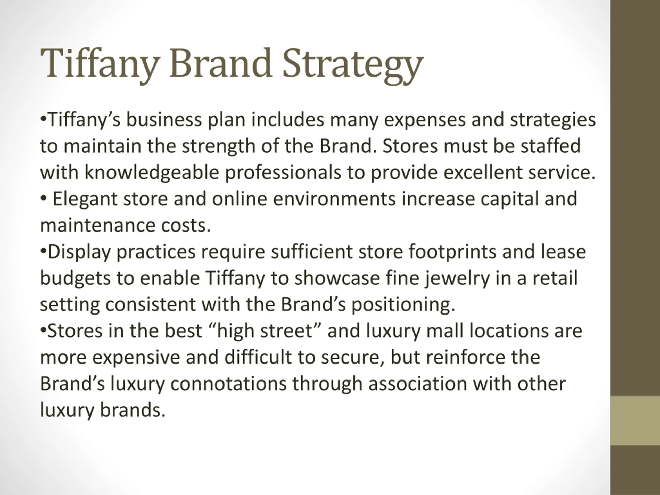 Tiffany Brand Strategy Tiffany s business plan includes many expenses and strategies to maintain the strength of the Brand. Stores must be staffed with knowledgeable professionals to provide excellent service. Elegant store and online environments increase capital and maintenance costs. Display practices require sufficient store footprints and lease budgets to enable Tiffany to showcase fine jewelry in a retail setting consistent with the Brand s positioning. Stores in the best high street and luxury mall locations are more expensive and difficult to secure, but reinforce the Brand s luxury connotations through association with other luxury brands.
