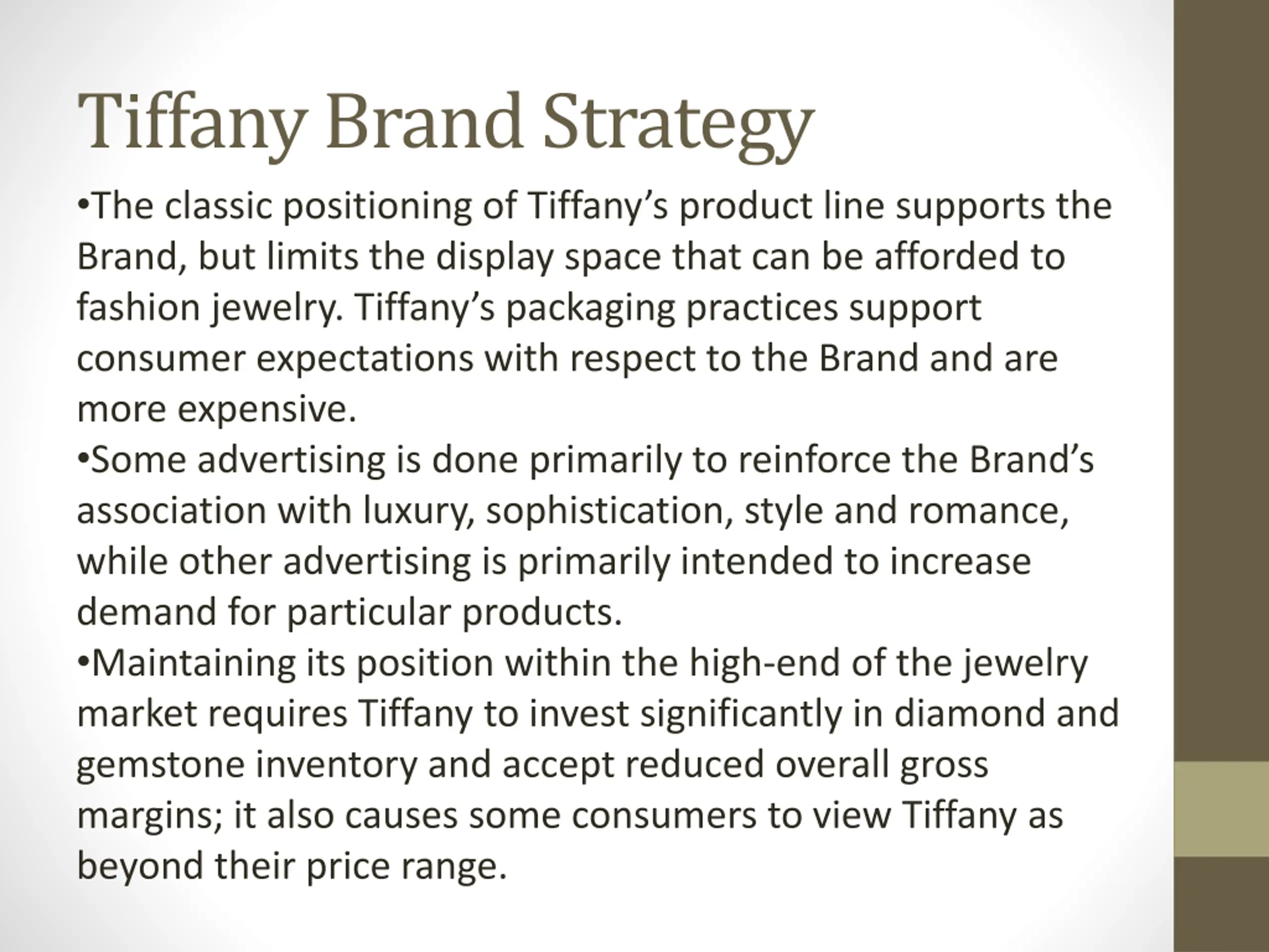 Tiffany Brand Strategy The classic positioning of Tiffany s product line supports the Brand, but limits the display space that can be afforded to fashion jewelry. Tiffany s packaging practices support consumer expectations with respect to the Brand and are more expensive. Some advertising is done primarily to reinforce the Brand s association with luxury, sophistication, style and romance, while other advertising is primarily intended to increase demand for particular products. Maintaining its position within the high-end of the jewelry market requires Tiffany to invest significantly in diamond and gemstone inventory and accept reduced overall gross margins; it also causes some consumers to view Tiffany as beyond their price range.