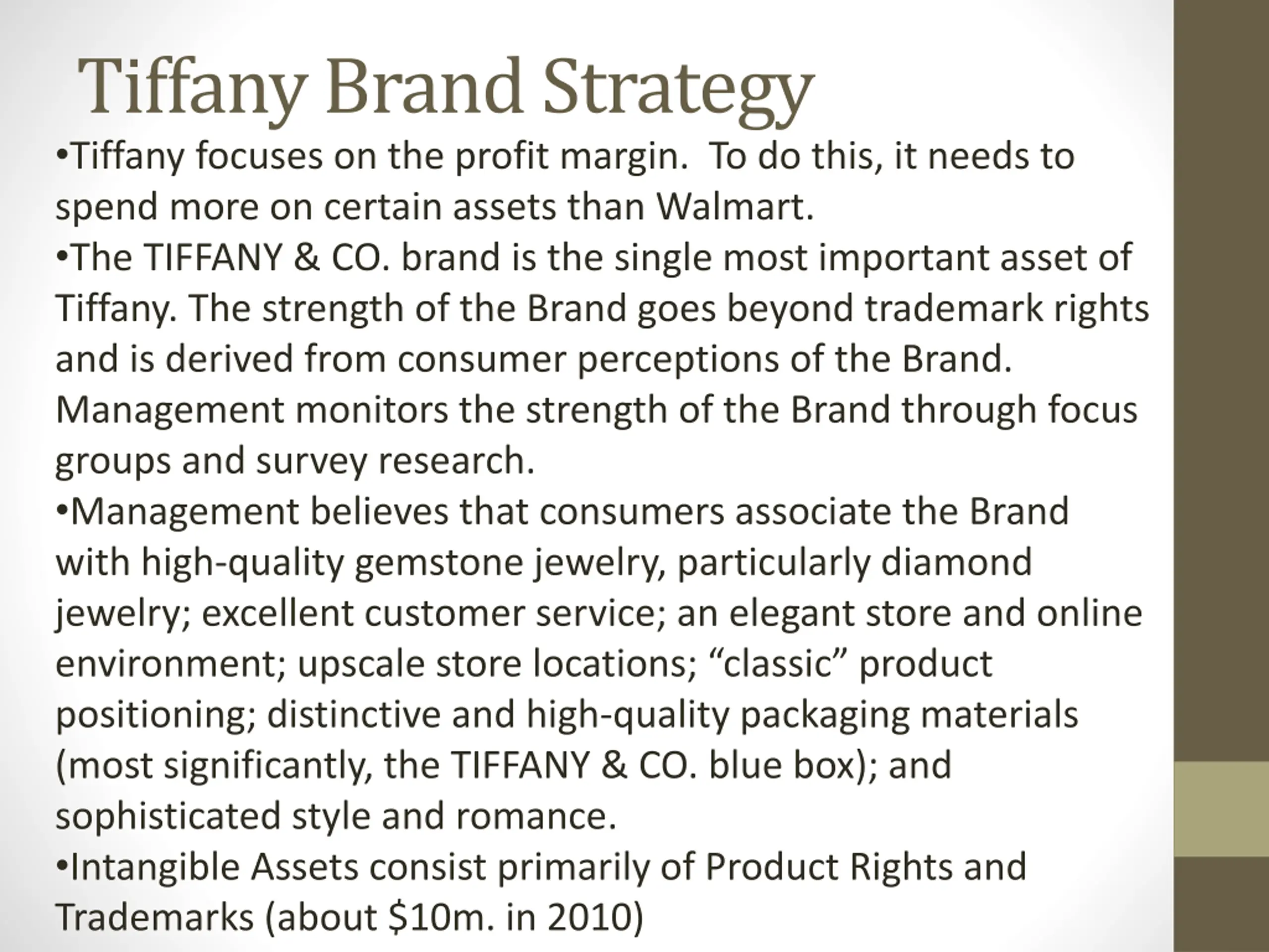 Tiffany Brand Strategy Tiffany focuses on the profit margin. To do this, it needs to spend more on certain assets than Walmart. The TIFFANY & CO. brand is the single most important asset of Tiffany. The strength of the Brand goes beyond trademark rights and is derived from consumer perceptions of the Brand. Management monitors the strength of the Brand through focus groups and survey research. Management believes that consumers associate the Brand with high-quality gemstone jewelry, particularly diamond jewelry; excellent customer service; an elegant store and online environment; upscale store locations; classic product positioning; distinctive and high-quality packaging materials (most significantly, the TIFFANY & CO. blue box); and sophisticated style and romance. Intangible Assets consist primarily of Product Rights and Trademarks (about $10m. in 2010)