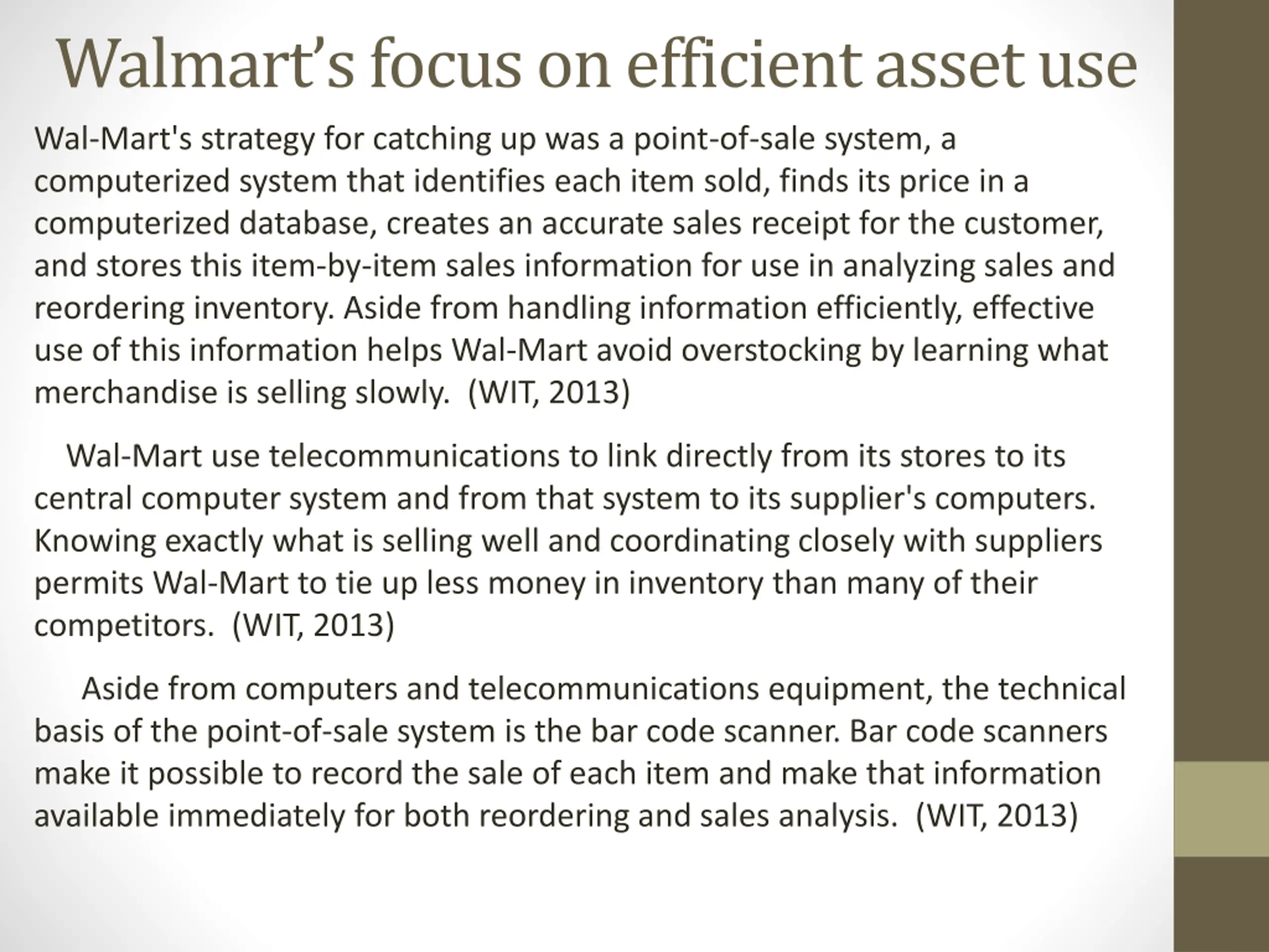 Walmarts focus on efficient asset use Wal-Mart's strategy for catching up was a point-of-sale system, a computerized system that identifies each item sold, finds its price in a computerized database, creates an accurate sales receipt for the customer, and stores this item-by-item sales information for use in analyzing sales and reordering inventory. Aside from handling information efficiently, effective use of this information helps Wal-Mart avoid overstocking by learning what merchandise is selling slowly. (WIT, 2013) Wal-Mart use telecommunications to link directly from its stores to its central computer system and from that system to its supplier's computers. Knowing exactly what is selling well and coordinating closely with suppliers permits Wal-Mart to tie up less money in inventory than many of their competitors. (WIT, 2013) Aside from computers and telecommunications equipment, the technical basis of the point-of-sale system is the bar code scanner. Bar code scanners make it possible to record the sale of each item and make that information available immediately for both reordering and sales analysis. (WIT, 2013)