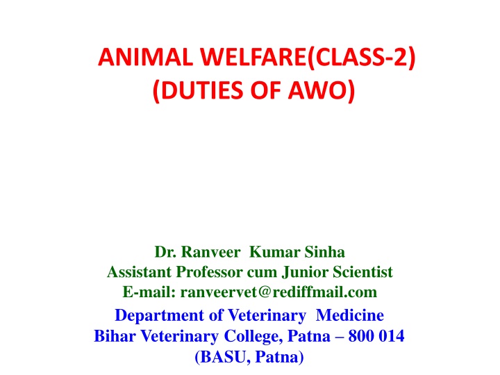 ANIMAL WELFARE(CLASS-2) (DUTIES OF AWO) Dr. Ranveer Kumar Sinha Assistant Professor cum Junior Scientist E-mail: ranveervet@rediffmail.com Department of Veterinary Medicine Bihar Veterinary College, Patna 800 014 (BASU, Patna)