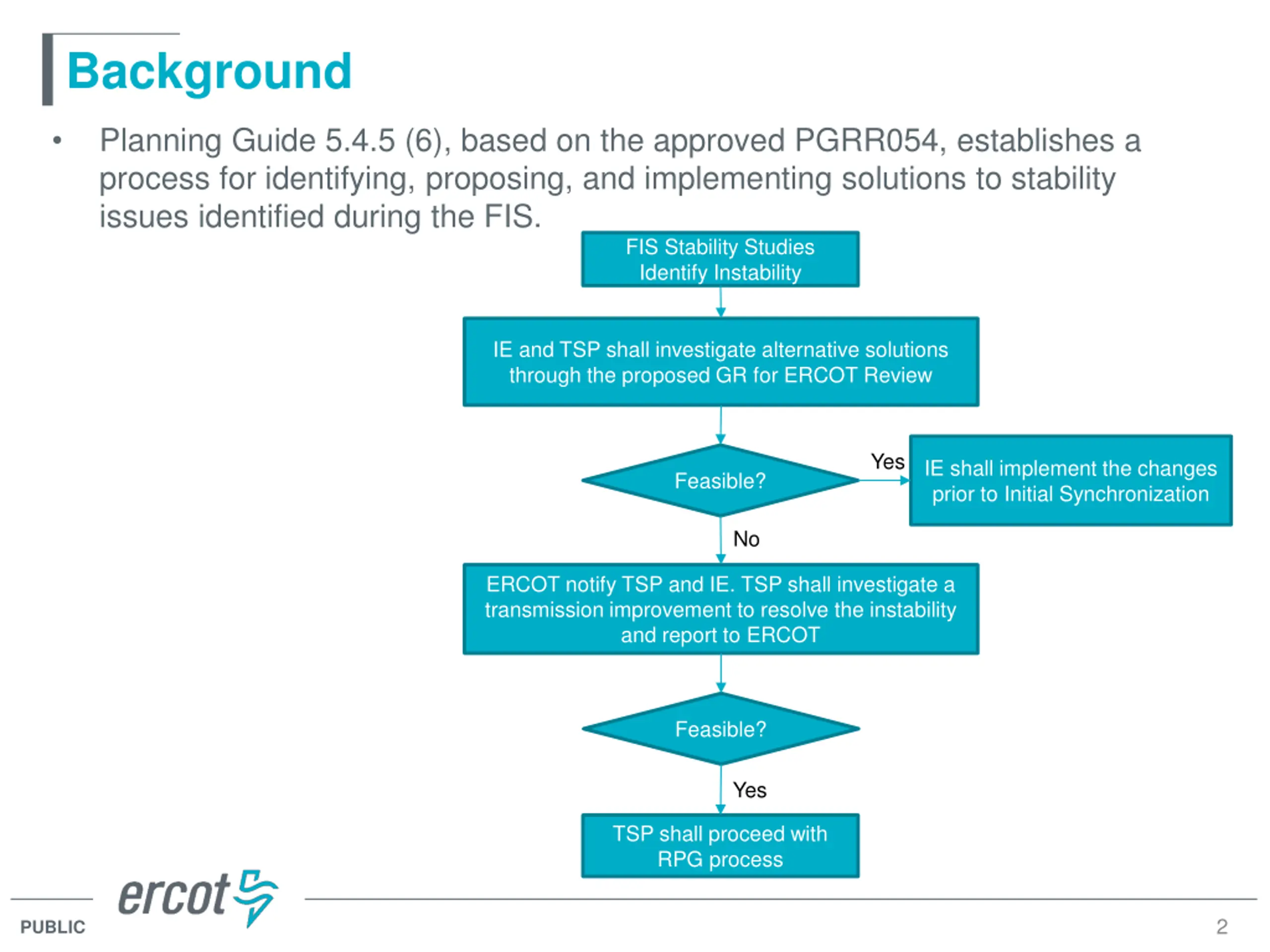 Background Planning Guide 5.4.5 (6), based on the approved PGRR054, establishes a process for identifying, proposing, and implementing solutions to stability issues identified during the FIS. FIS Stability Studies Identify Instability IE and TSP shall investigate alternative solutions through the proposed GR for ERCOT Review Yes IE shall implement the changes prior to Initial Synchronization Feasible? No ERCOT notify TSP and IE. TSP shall investigate a transmission improvement to resolve the instability and report to ERCOT Feasible? Yes TSP shall proceed with RPG process 2 PUBLIC