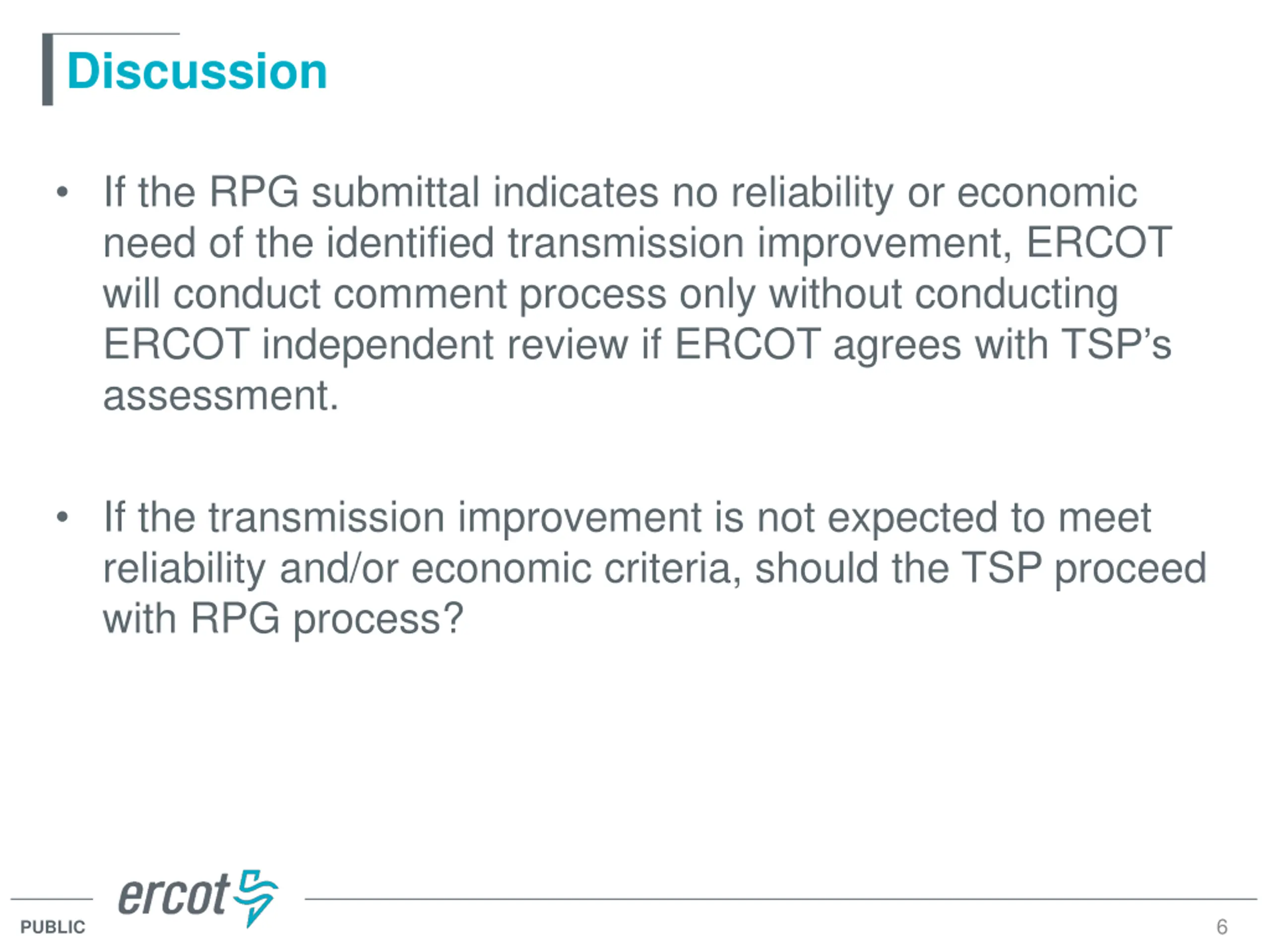 Discussion If the RPG submittal indicates no reliability or economic need of the identified transmission improvement, ERCOT will conduct comment process only without conducting ERCOT independent review if ERCOT agrees with TSP s assessment. If the transmission improvement is not expected to meet reliability and/or economic criteria, should the TSP proceed with RPG process? 6 PUBLIC