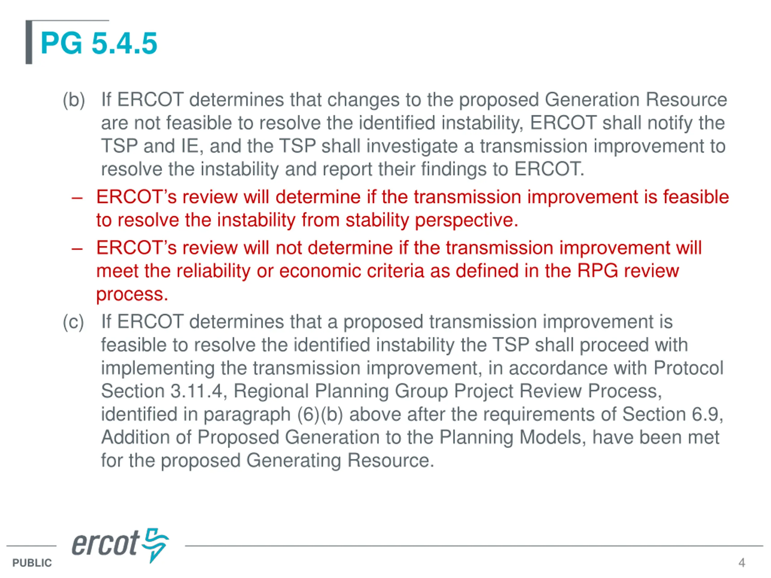 PG 5.4.5 (b) If ERCOT determines that changes to the proposed Generation Resource are not feasible to resolve the identified instability, ERCOT shall notify the TSP and IE, and the TSP shall investigate a transmission improvement to resolve the instability and report their findings to ERCOT. ERCOT s review will determine if the transmission improvement is feasible to resolve the instability from stability perspective. ERCOT s review will not determine if the transmission improvement will meet the reliability or economic criteria as defined in the RPG review process. (c) If ERCOT determines that a proposed transmission improvement is feasible to resolve the identified instability the TSP shall proceed with implementing the transmission improvement, in accordance with Protocol Section 3.11.4, Regional Planning Group Project Review Process, identified in paragraph (6)(b) above after the requirements of Section 6.9, Addition of Proposed Generation to the Planning Models, have been met for the proposed Generating Resource. 4 PUBLIC