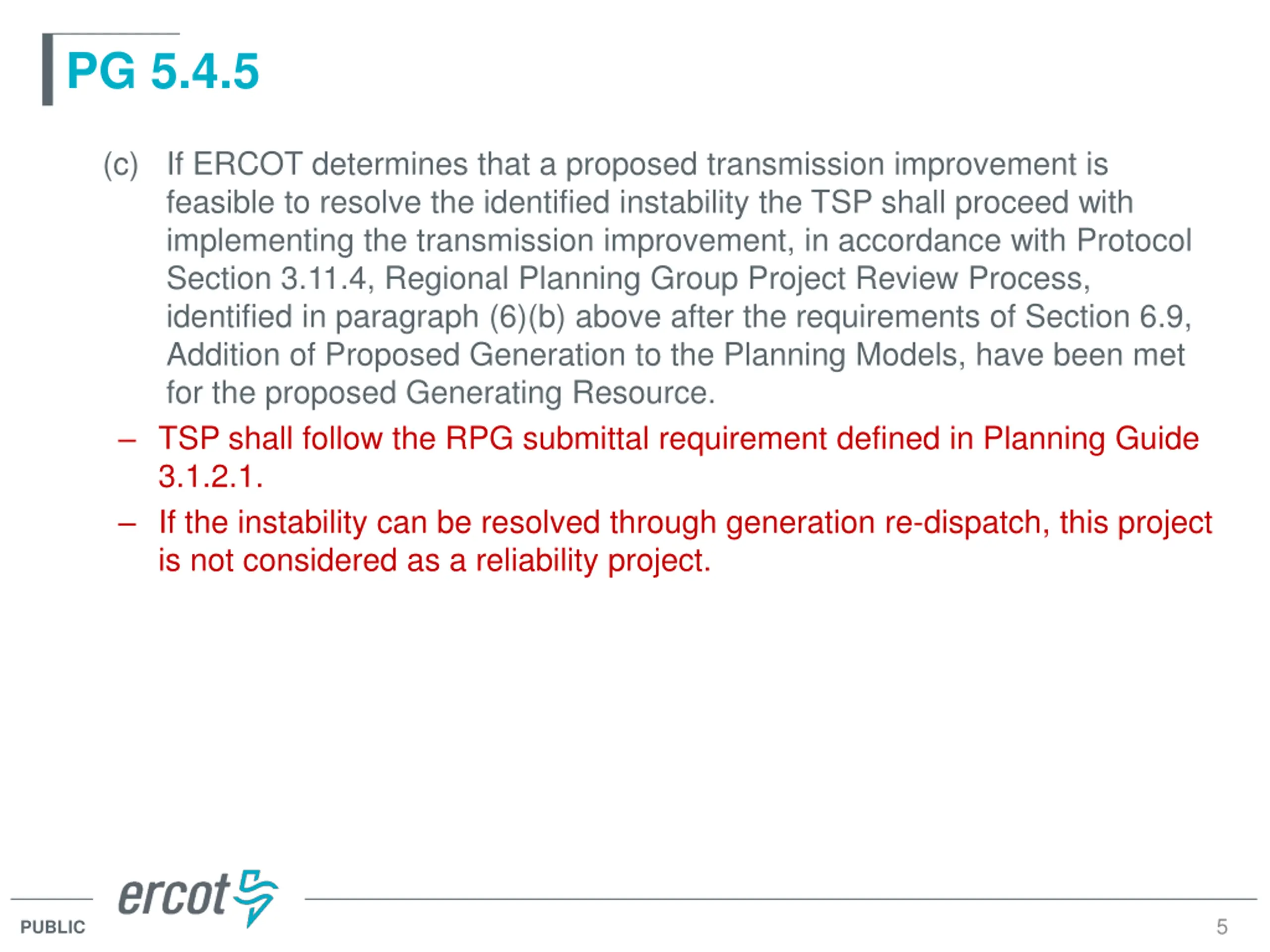 PG 5.4.5 (c) If ERCOT determines that a proposed transmission improvement is feasible to resolve the identified instability the TSP shall proceed with implementing the transmission improvement, in accordance with Protocol Section 3.11.4, Regional Planning Group Project Review Process, identified in paragraph (6)(b) above after the requirements of Section 6.9, Addition of Proposed Generation to the Planning Models, have been met for the proposed Generating Resource. TSP shall follow the RPG submittal requirement defined in Planning Guide 3.1.2.1. If the instability can be resolved through generation re-dispatch, this project is not considered as a reliability project. 5 PUBLIC