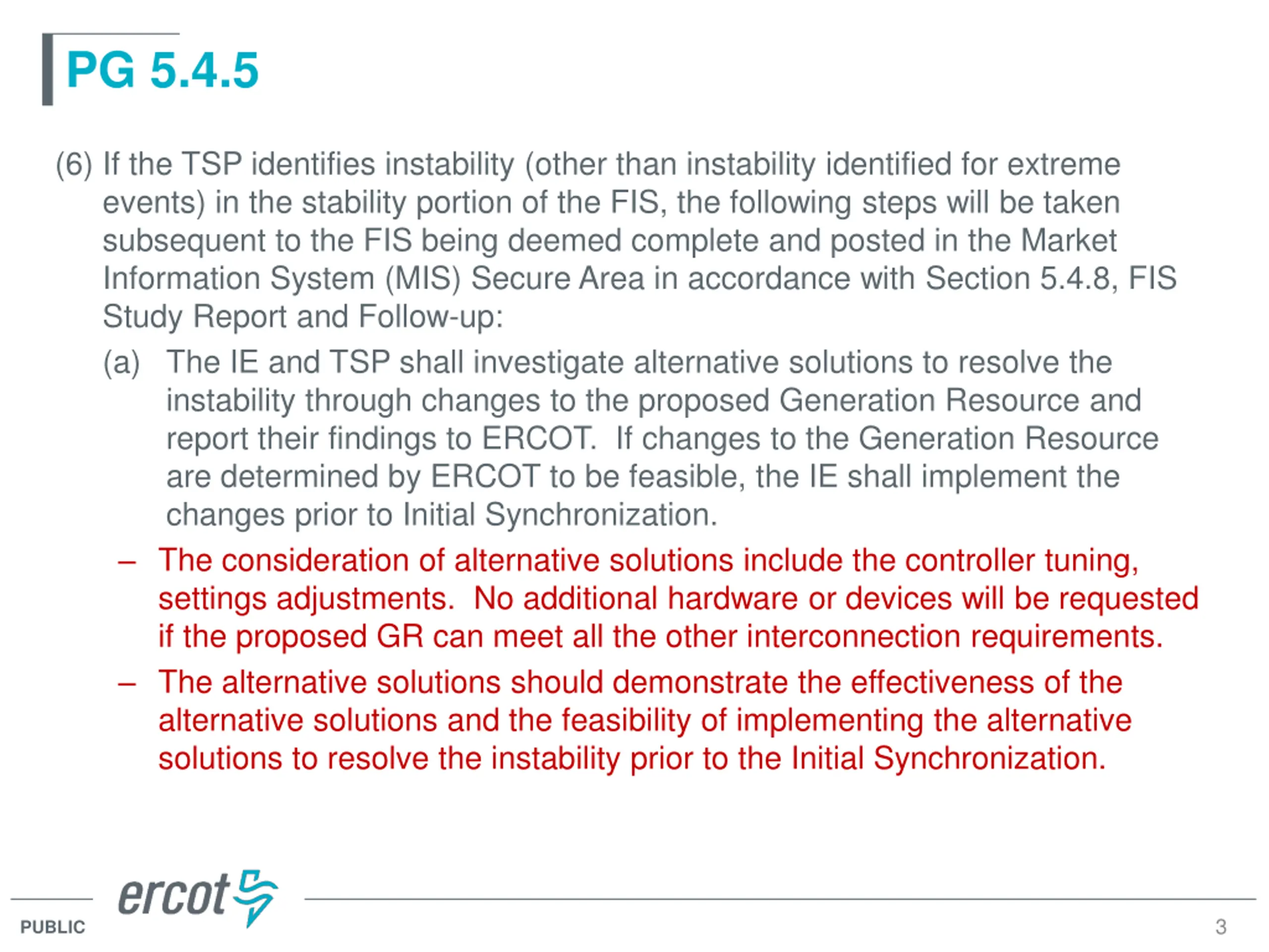 PG 5.4.5 (6) If the TSP identifies instability (other than instability identified for extreme events) in the stability portion of the FIS, the following steps will be taken subsequent to the FIS being deemed complete and posted in the Market Information System (MIS) Secure Area in accordance with Section 5.4.8, FIS Study Report and Follow-up: (a) The IE and TSP shall investigate alternative solutions to resolve the instability through changes to the proposed Generation Resource and report their findings to ERCOT. If changes to the Generation Resource are determined by ERCOT to be feasible, the IE shall implement the changes prior to Initial Synchronization. The consideration of alternative solutions include the controller tuning, settings adjustments. No additional hardware or devices will be requested if the proposed GR can meet all the other interconnection requirements. The alternative solutions should demonstrate the effectiveness of the alternative solutions and the feasibility of implementing the alternative solutions to resolve the instability prior to the Initial Synchronization. 3 PUBLIC