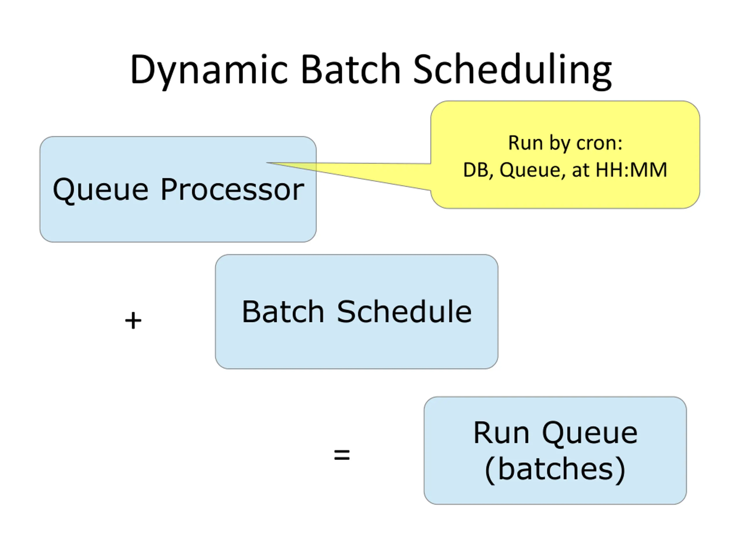 Dynamic Batch Scheduling Run by cron: DB, Queue, at HH:MM Queue Processor Batch Schedule + Run Queue (batches) =