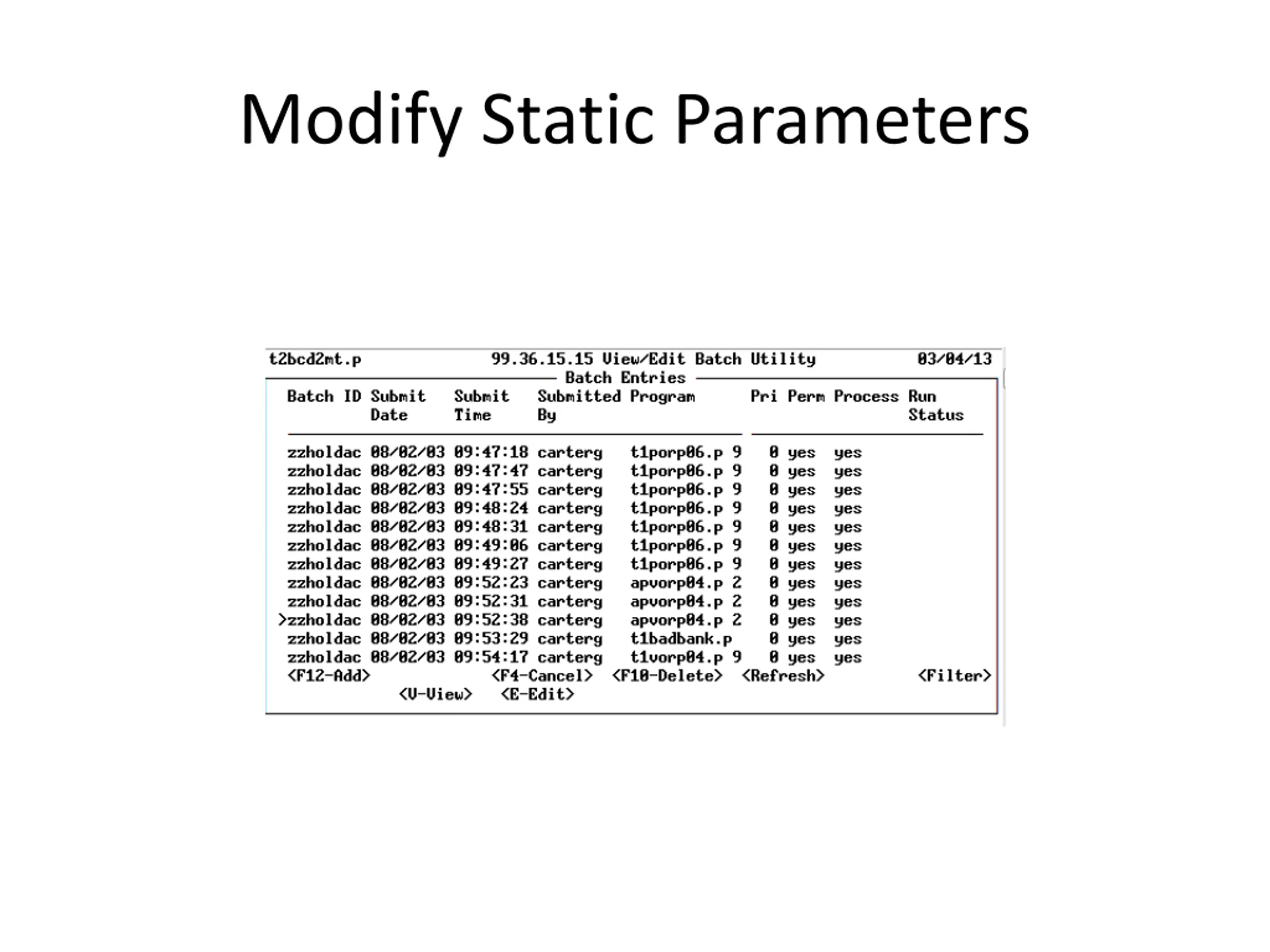 Dynamic Operations Literal - the data entered in the value field Unix Environment Variable: The Unix environment variable name is entered in the value field. The date that is returned by the Date Formula that is entered in the value field Substring of a value. Three parameters are entered in the value field: Value of another parameter Month of a date returned by the Date Formula that is entered in the value field Day of a date returned by the Date Formula that is entered in the value field Year of a date returned by the Date Formula that is entered in the value field - the 2 digit year is returned Blank U D S P MM DD Y2 Year of a date returned by the Date Formula that is entered in the value field - 4 digit year is returned Value of another parameter. This is used when "con-cating" the values of fields together. Y4 V