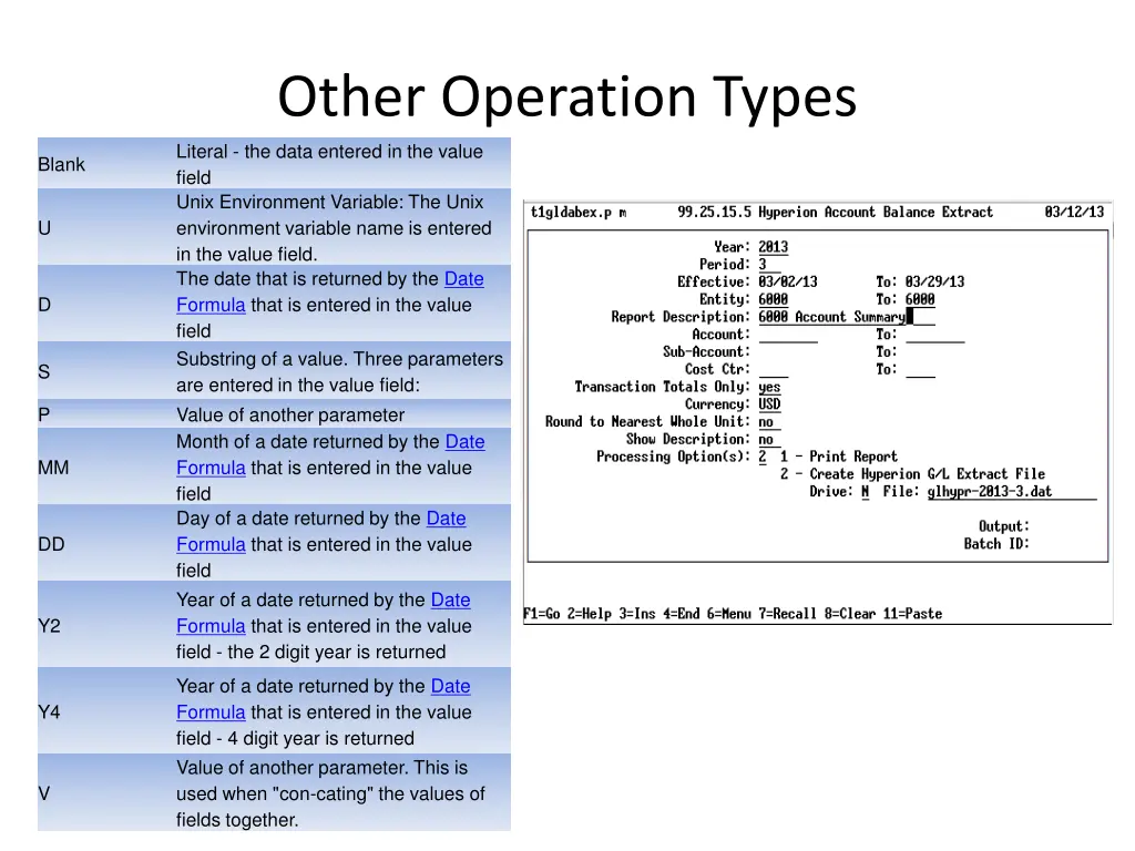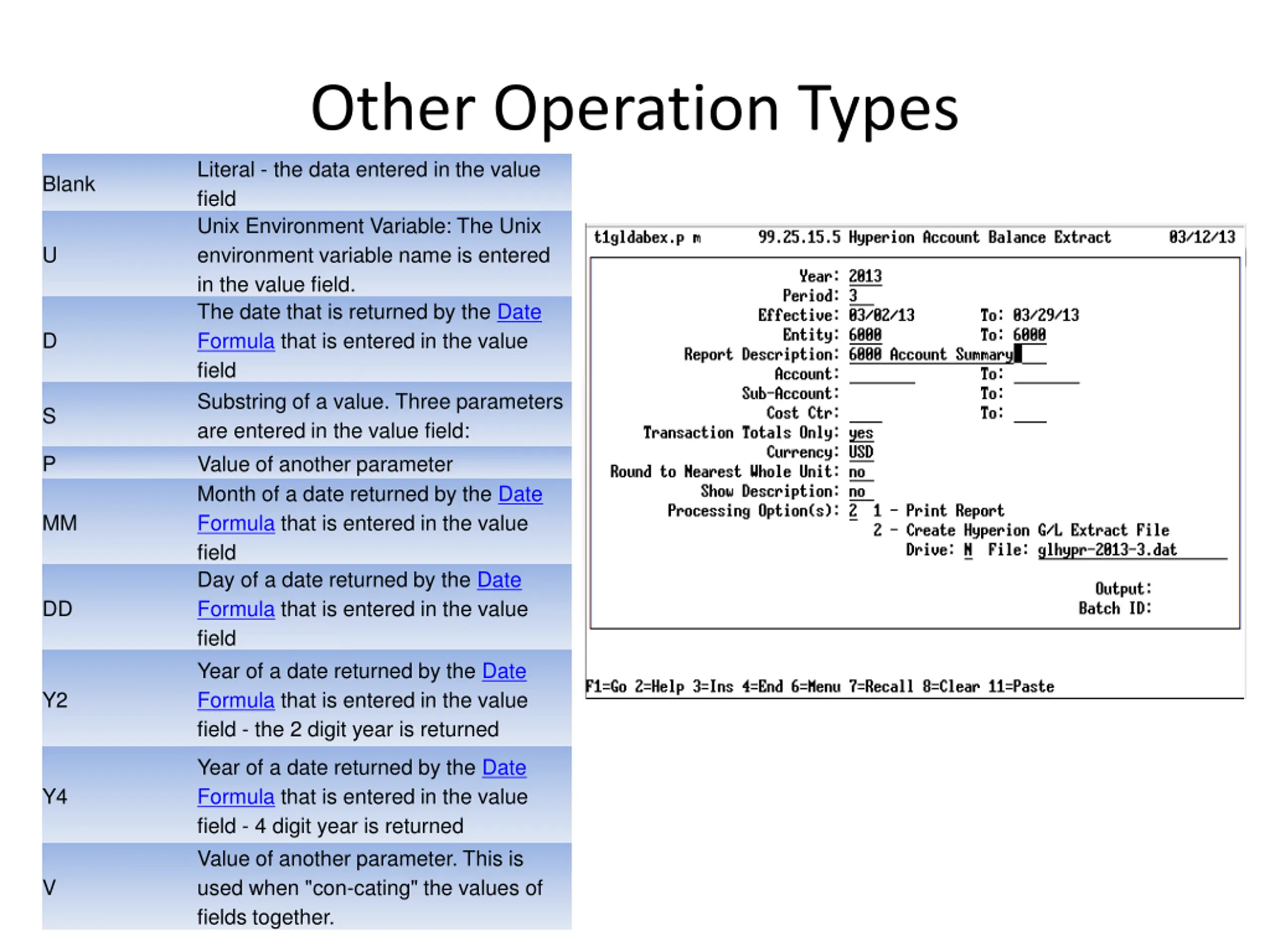 Other Operation Types Literal - the data entered in the value field Unix Environment Variable: The Unix environment variable name is entered in the value field. The date that is returned by the Date Formula that is entered in the value field Substring of a value. Three parameters are entered in the value field: Value of another parameter Month of a date returned by the Date Formula that is entered in the value field Day of a date returned by the Date Formula that is entered in the value field Year of a date returned by the Date Formula that is entered in the value field - the 2 digit year is returned Blank U D S P MM DD Y2 Year of a date returned by the Date Formula that is entered in the value field - 4 digit year is returned Value of another parameter. This is used when "con-cating" the values of fields together. Y4 V