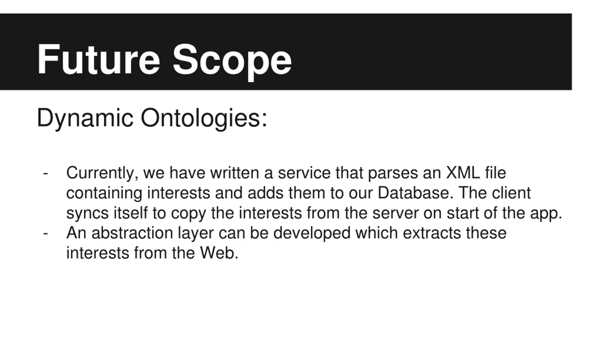 Future Scope Dynamic Ontologies: - Currently, we have written a service that parses an XML file containing interests and adds them to our Database. The client syncs itself to copy the interests from the server on start of the app. An abstraction layer can be developed which extracts these interests from the Web. -