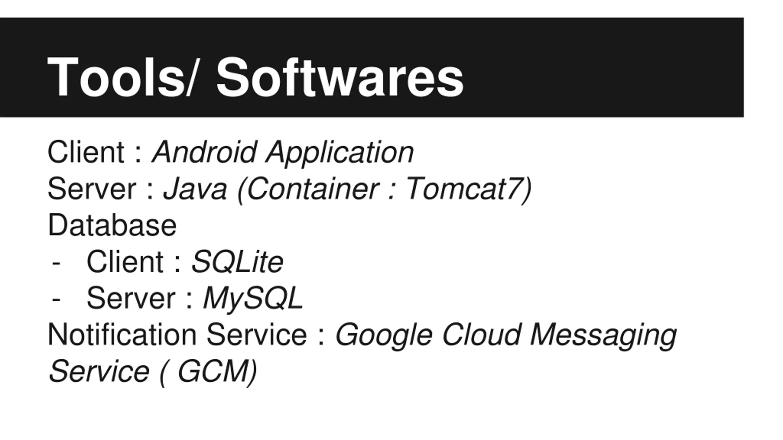 Tools/ Softwares Client : Android Application Server : Java (Container : Tomcat7) Database - Client : SQLite - Server : MySQL Notification Service : Google Cloud Messaging Service ( GCM)