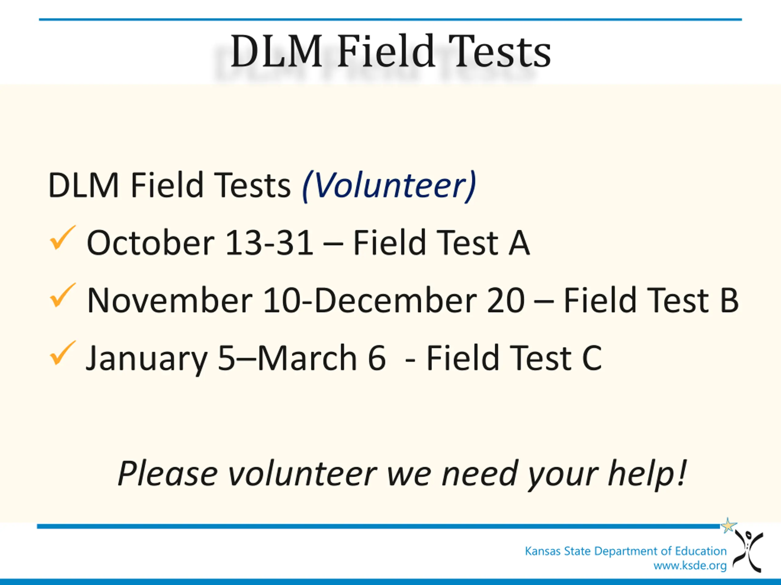 DLM Field Tests DLM Field Tests (Volunteer) October 13-31 Field Test A November 10-December 20 Field Test B January 5 March 6 - Field Test C Please volunteer we need your help! Kansas State Department of Education www.ksde.org