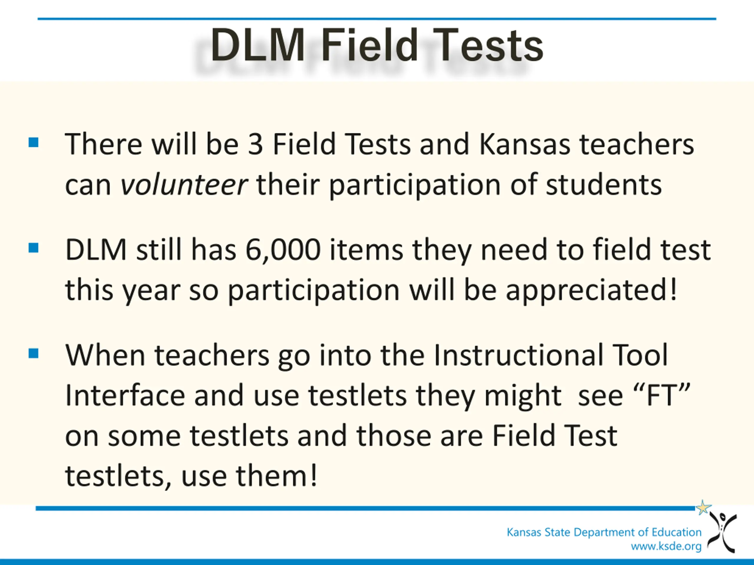 DLM Field Tests There will be 3 Field Tests and Kansas teachers can volunteer their participation of students DLM still has 6,000 items they need to field test this year so participation will be appreciated! When teachers go into the Instructional Tool Interface and use testlets they might see FT on some testlets and those are Field Test testlets, use them! Kansas State Department of Education www.ksde.org