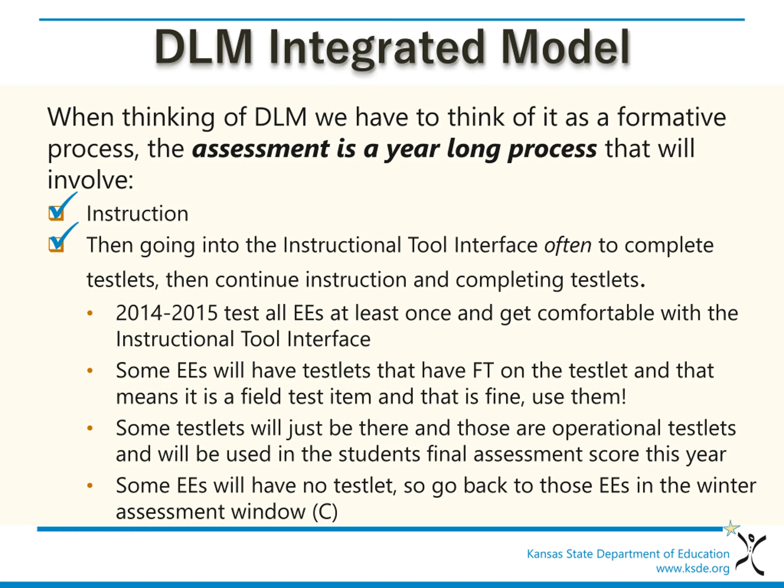 DLM Integrated Model When thinking of DLM we have to think of it as a formative process, the assessment is a year long process that will involve: Instruction Then going into the Instructional Tool Interface often to complete testlets, then continue instruction and completing testlets. 2014-2015 test all EEs at least once and get comfortable with the Instructional Tool Interface Some EEs will have testlets that have FT on the testlet and that means it is a field test item and that is fine, use them! Some testlets will just be there and those are operational testlets and will be used in the students final assessment score this year Some EEs will have no testlet, so go back to those EEs in the winter assessment window (C) Kansas State Department of Education www.ksde.org