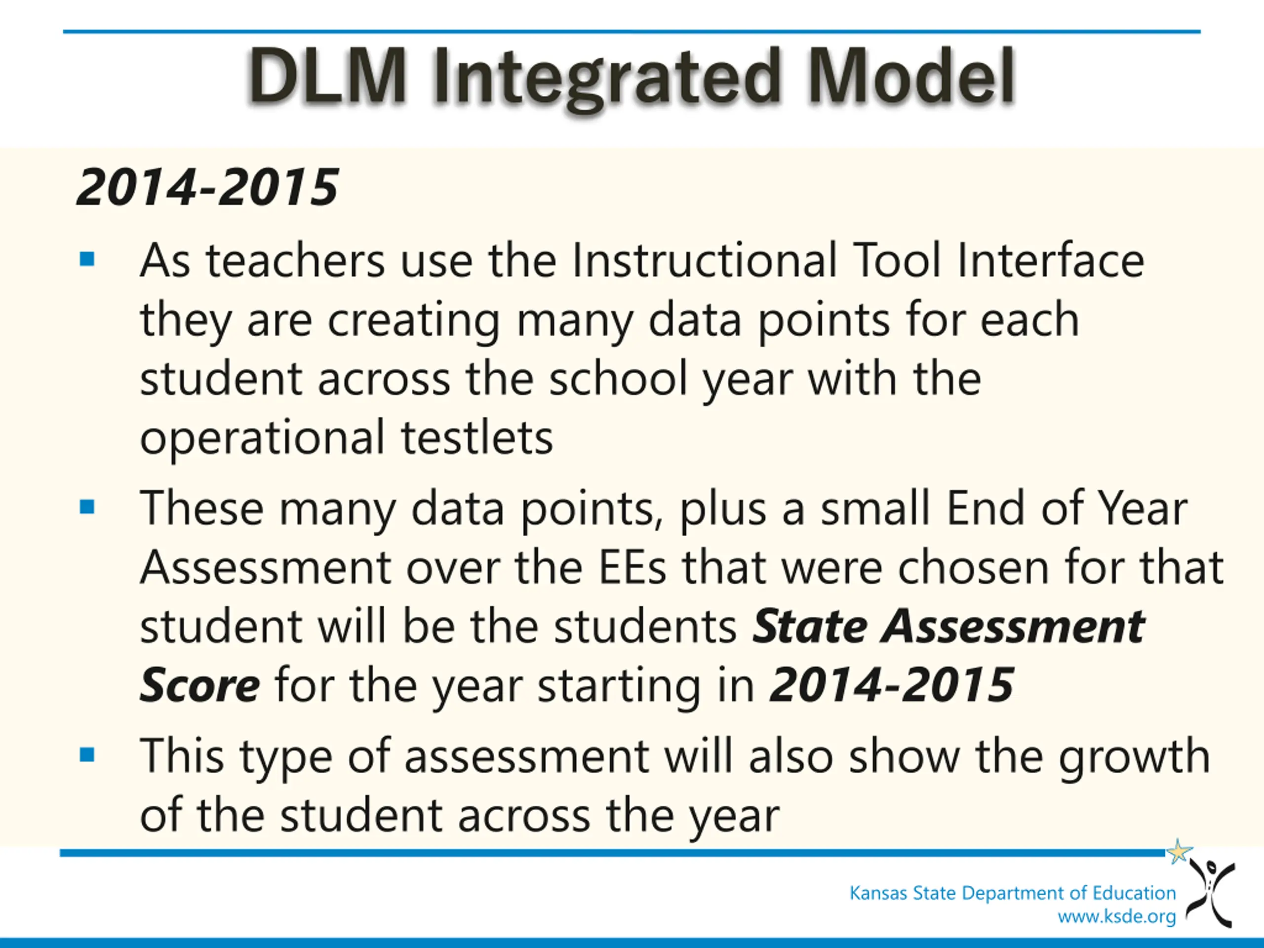 DLM Integrated Model 2014-2015 As teachers use the Instructional Tool Interface they are creating many data points for each student across the school year with the operational testlets These many data points, plus a small End of Year Assessment over the EEs that were chosen for that student will be the students State Assessment Score for the year starting in 2014-2015 This type of assessment will also show the growth of the student across the year Kansas State Department of Education www.ksde.org